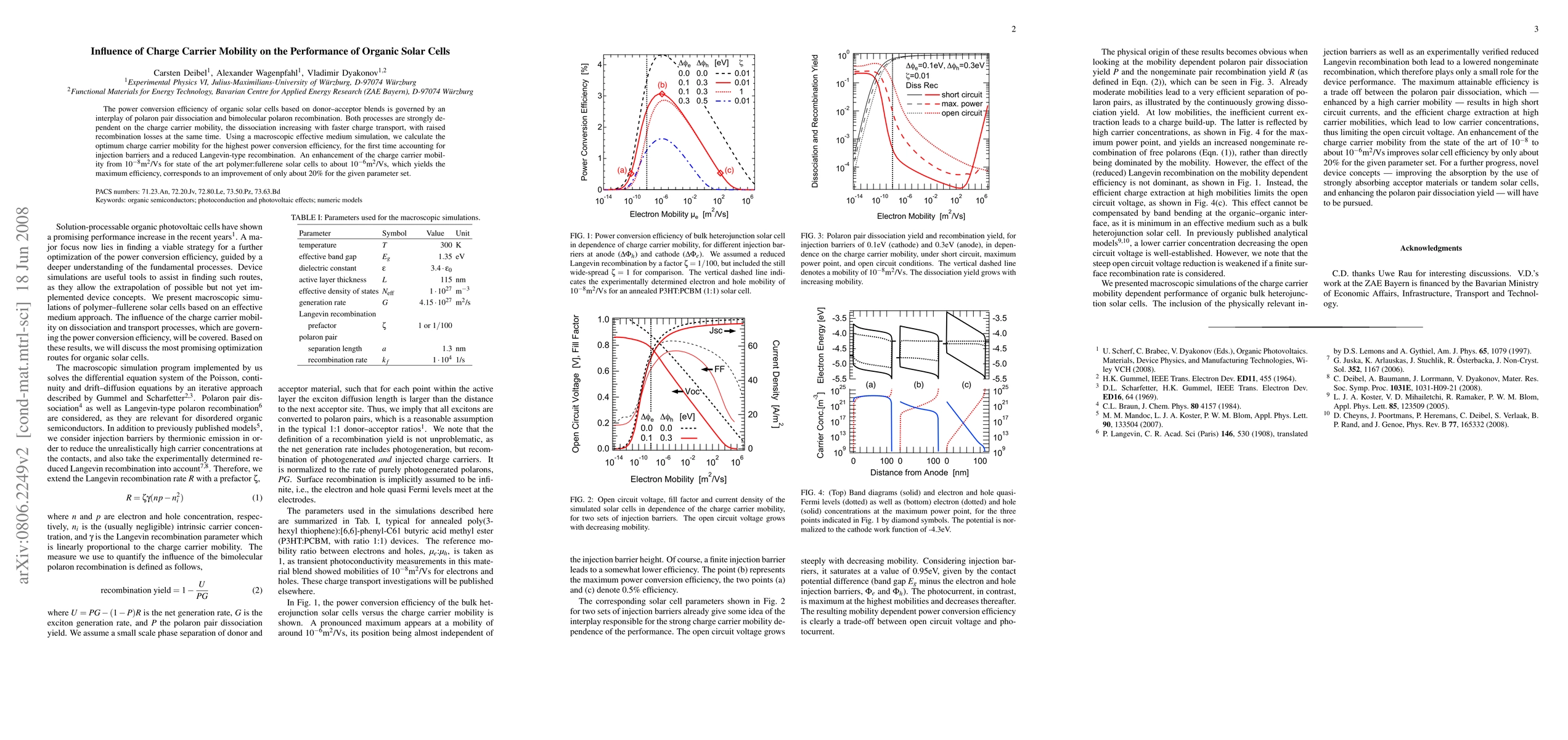 This study investigates how charge carrier mobility affects the efficiency of organic solar cells, finding that higher mobility boosts dissociation but increases recombination losses. The optimal mobility for maximum efficiency, accounting for barriers and reduced recombination, is around $10^{-6}$m$^2$/Vs, yielding a 20% efficiency improvement over current technologies.