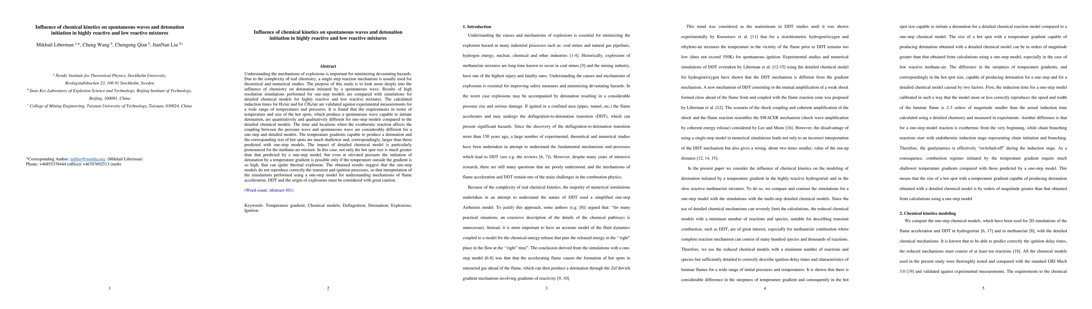 This study investigates the impact of detailed chemical kinetics on the initiation of detonation by spontaneous waves in reactive mixtures. Results from high-resolution simulations show that one-step models significantly differ from detailed chemical models in predicting the conditions necessary for detonation initiation, especially for methane-air mixtures.
