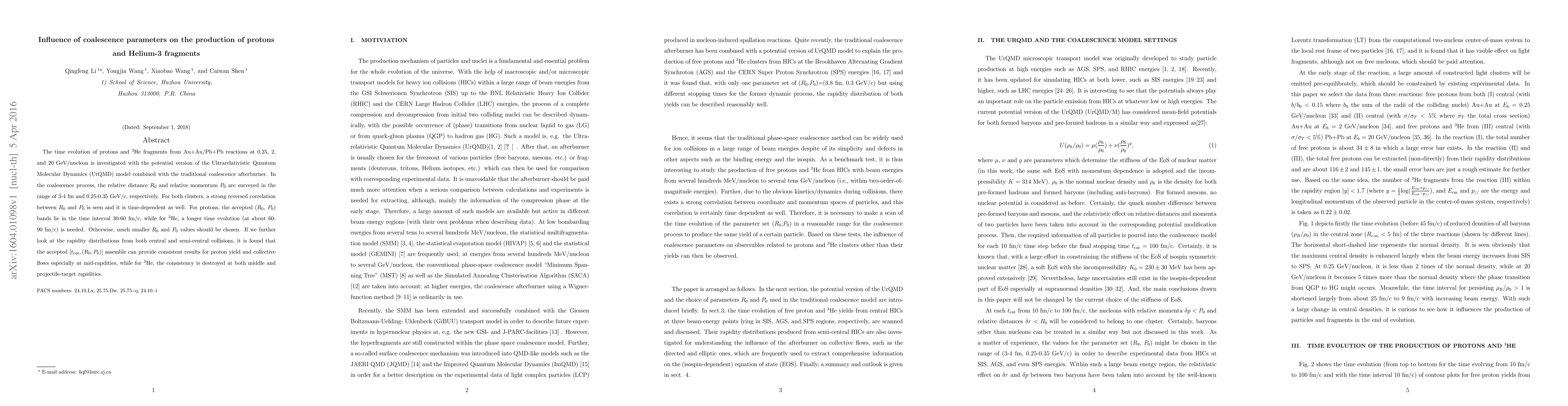 The time evolution of protons and $^3$He fragments from Au+Au/Pb+Pb reactions at 0.25, 2, and 20 GeV$/$nucleon is investigated with the potential version of the Ultrarelativistic Quantum Molecular Dynamics (UrQMD) model combined with the traditional coalescence afterburner. In the coalescence process, the relative distance $R_0$ and relative momentum $P_0$ are surveyed in the range of 3-4 fm and 0.25-0.35 GeV$/$c, respectively. For both clusters, a strong reversed correlation between $R_0$ and $P_0$ is seen and it is time-dependent as well. For protons, the accepted ($R_0$, $P_0$) bands lie in the time interval 30-60 fm$/$c, while for $^3$He, a longer time evolution (at about 60-90 fm$/$c) is needed. Otherwise, much smaller $R_0$ and $P_0$ values should be chosen. If we further look at the rapidity distributions from both central and semi-central collisions, it is found that the accepted [$t_{\rm cut}, (R_0, P_0$)] assemble can provide consistent results for proton yield and collective flows especially at mid-rapdities, while for $^3$He, the consistency is destroyed at both middle and projectile-target rapidities.