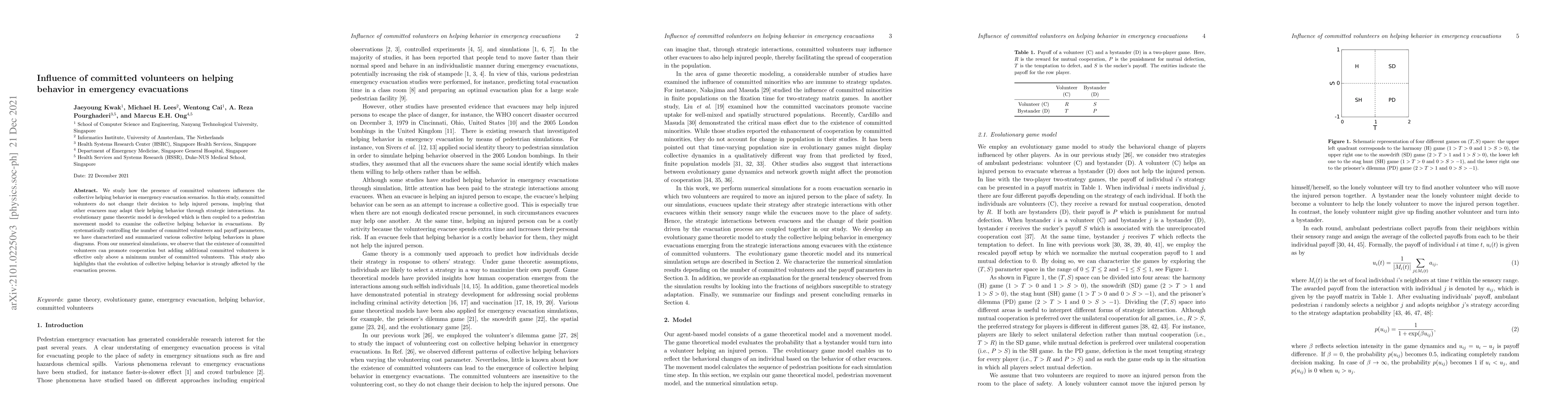 This study uses an evolutionary game theory model combined with a pedestrian movement model to explore how committed volunteers impact collective helping behavior during emergency evacuations. Results indicate that committed volunteers can promote cooperation, but only when their number exceeds a critical threshold, and the evolution of cooperative behavior is significantly influenced by the evacuation process.