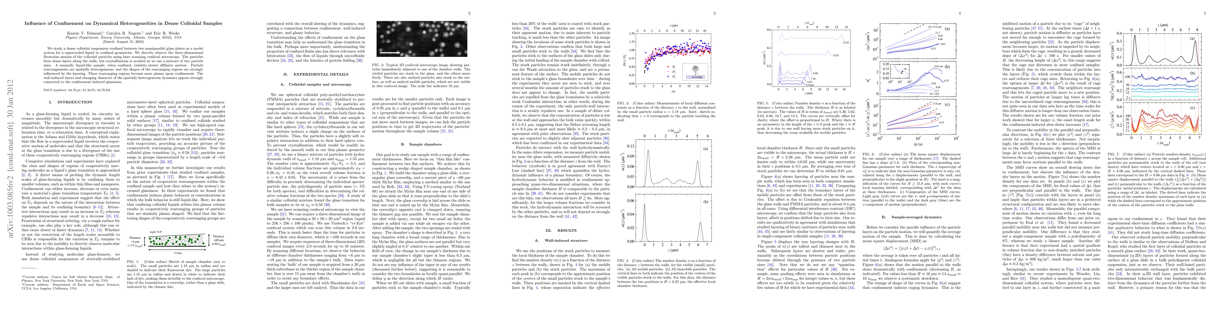This study investigates how confinement affects the dynamics of dense colloidal suspensions, observing slower diffusive motion and spatially heterogeneous particle rearrangements that become more planar, linking these changes to confinement-induced glassiness. Laser scanning confocal microscopy reveals the three-dimensional Brownian motion, highlighting the influence of wall-induced layering on dynamical heterogeneities.