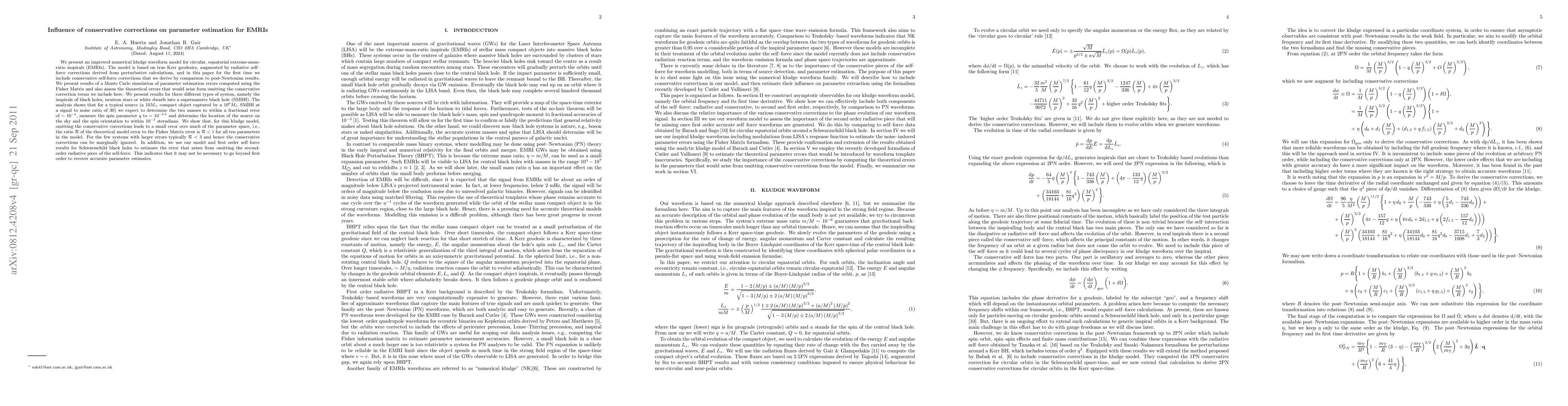 We present an improved numerical kludge waveform model for circular, equatorial EMRIs. The model is based on true Kerr geodesics, augmented by radiative self-force corrections derived from perturbative calculations, and in this paper for the first time we include conservative self-force corrections that we derive by comparison to post-Newtonian results. We present results of a Monte Carlo simulation of parameter estimation errors computed using the Fisher Matrix and also assess the theoretical errors that would arise form omitting the conservative correction terms we include here. We present results for three different types of system, namely the inspirals of black holes, neutron stars or white dwarfs into a supermassive black hole (SMBH). The analysis shows that for a typical source (a 10 solar mass compact object captured by a one million solar mass SMBH at signal to noise ratio of 30) we expect to determine the two masses to within a fractional error of ~0.0001, measure the spin parameter q to ~0.00003 and determine the location of the source on the sky and the spin orientation to within 0.001 steradians. We show that, for this kludge model, omitting the conservative corrections leads to a small error over much of the parameter space, i.e., the ratio R of the theoretical model error to the Fisher Matrix error is R<1 for all ten parameters in the model. For the few systems with larger errors typically R<3 and hence the conservative corrections can be marginally ignored. In addition, we use our model and first order self-force results for Schwarzschild black holes to estimate the error that arises from omitting the second-order radiative piece of the self-force. This indicates that it may not be necessary to go beyond first order to recover accurate parameter estimates.