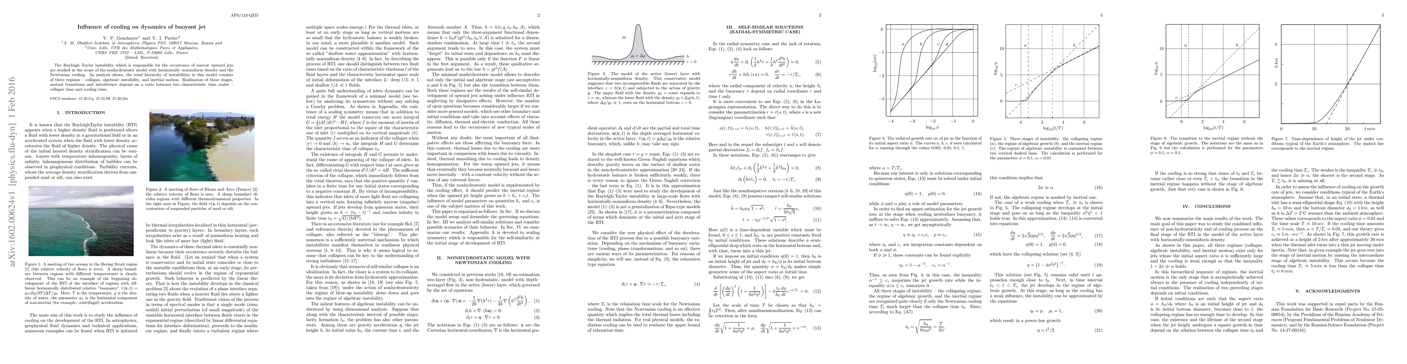 The Rayleigh--Taylor instability which is responsible for the occurrence of narrow upward jets are studied in the scope of the nonhydrostatic model with horizontally--nonuniform density and the Newtonian cooling. As analysis shows, the total hierarchy of instabilities in this model consists of three regimes -- collapse, algebraic instability, and inertial motion. Realization of these stages, mutual transitions and interference depend on a ratio between two characteristic time scales -- collapse time and cooling time.