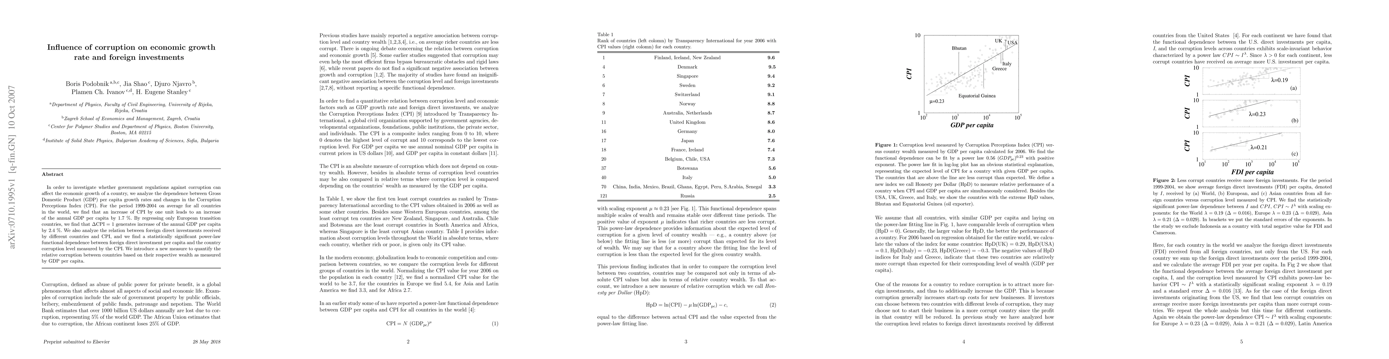 In order to investigate whether government regulations against corruption can affect the economic growth of a country, we analyze the dependence between Gross Domestic Product (GDP) per capita growth rates and changes in the Corruption Perceptions Index (CPI). For the period 1999-2004 on average for all countries in the world, we find that an increase of CPI by one unit leads to an increase of the annual GDP per capita by 1.7 %. By regressing only European transition countries, we find that $\Delta$CPI = 1 generates increase of the annual GDP per capita by 2.4 %. We also analyze the relation between foreign direct investments received by different countries and CPI, and we find a statistically significant power-law functional dependence between foreign direct investment per capita and the country corruption level measured by the CPI. We introduce a new measure to quantify the relative corruption between countries based on their respective wealth as measured by GDP per capita.