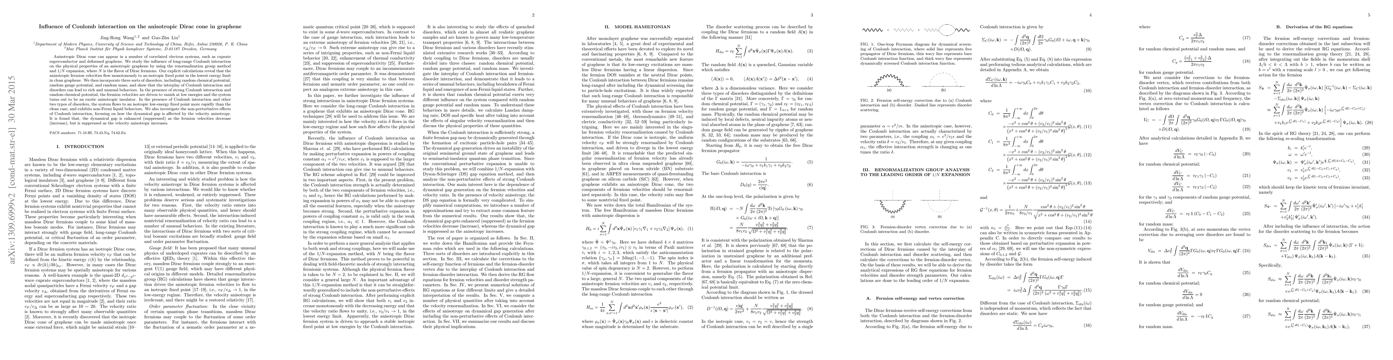 This paper investigates the impact of long-range Coulomb interaction on anisotropic Dirac cones in graphene using renormalization group methods and 1/N expansion. It finds that the interaction drives anisotropic fermion velocities to an isotropic fixed point in clean graphene, but introduces exotic insulating and non-Fermi liquid behaviors when combined with various disorder types.