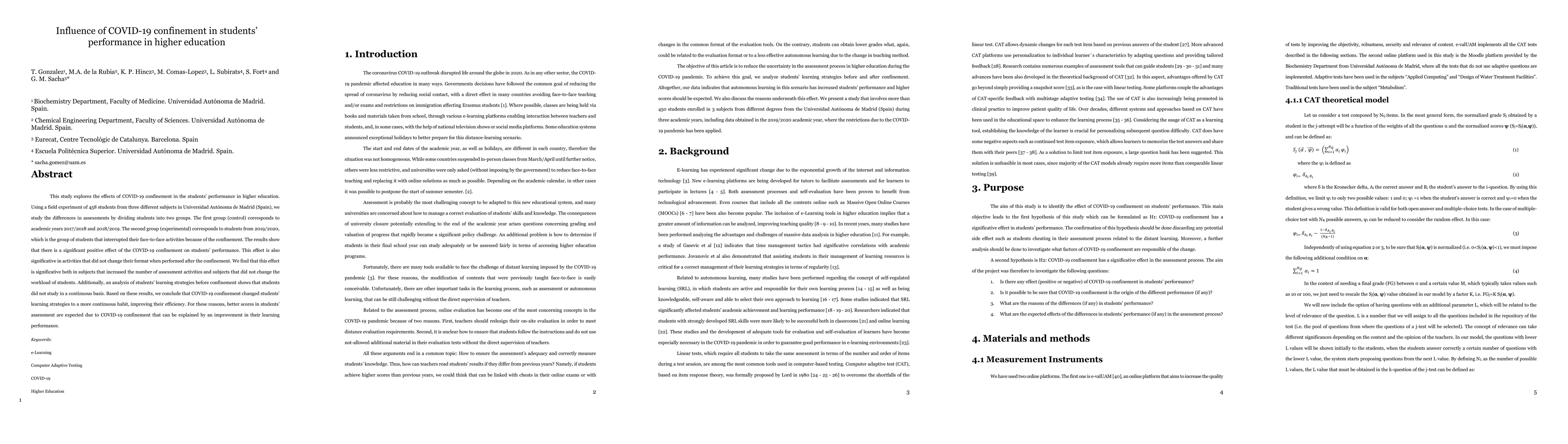 This study explores the effects of COVID-19 confinement in the students performance in higher education. Using a field experiment of 458 students from three different subjects in Universidad Autonoma de Madrid (Spain), we study the differences in assessments by dividing students into two groups. The first group (control) corresponds to academic years 2017/2018 and 2018/2019. The second group (experimental) corresponds to students from 2019/2020, which is the group of students that interrupted their face-to-face activities because of the confinement. The results show that there is a significant positive effect of the COVID-19 confinement on students performance. This effect is also significative in activities that did not change their format when performed after the confinement. We find that this effect is significative both in subjects that increased the number of assessment activities and subjects that did not change the workload of students. Additionally, an analysis of students learning strategies before confinement shows that students did not study in a continuous basis. Based on these results, we conclude that COVID-19 confinement changed students learning strategies to a more continuous habit, improving their efficiency. For these reasons, better scores in students assessment are expected due to COVID-19 confinement that can be explained by an improvement in their learning performance.