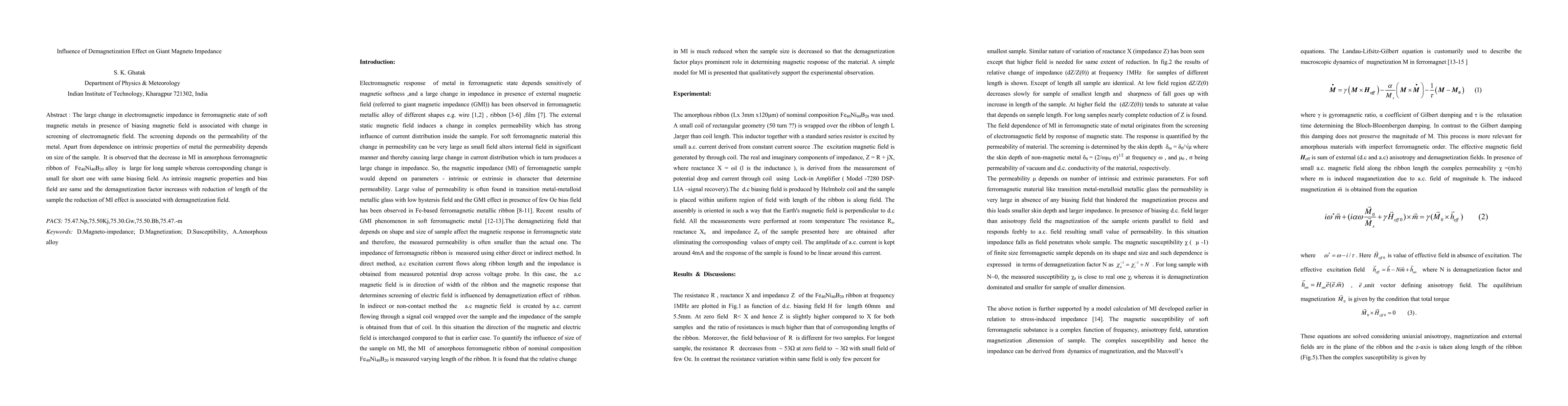 The large change in electromagnetic impedance in ferromagnetic state of soft magnetic metals in presence of biasing magnetic field is associated with change in screening of electromagnetic field. The screening depends on the permeability of the metal. Apart from dependence on intrinsic properties of metal the permeability depends on size of the sample. It is observed that the decrease in MI in amorphous ferromagnetic ribbon of Fe40Ni40B20 alloy is large for long sample whereas corresponding change is small for short one with same biasing field. As intrinsic magnetic properties and bias field are same and the demagnetization factor increases with reduction of length of the sample the reduction of MI effect is associated with demagnetization field.