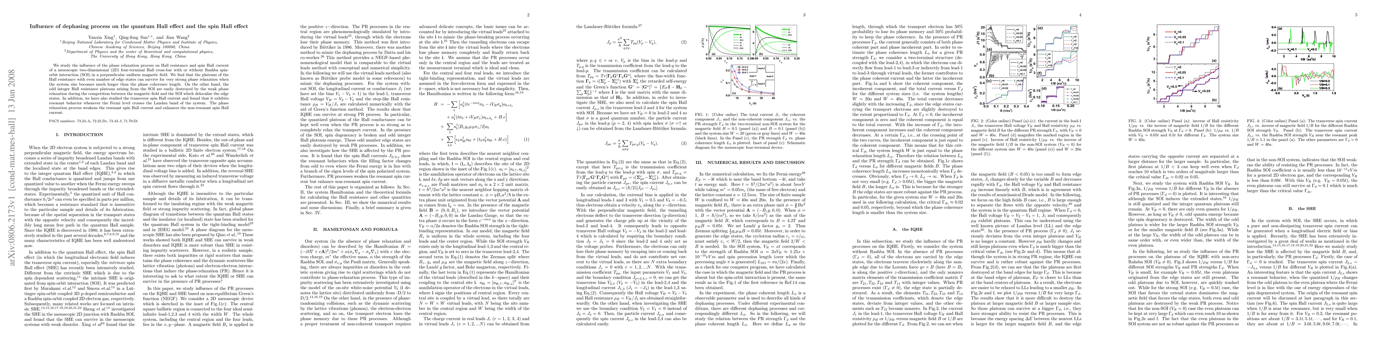 We study the influence of the phase relaxation process on Hall resistance and spin Hall current of a mesoscopic two-dimensional (2D) four-terminal Hall cross-bar with or without Rashba spin-orbit interaction (SOI) in a perpendicular uniform magnetic field. We find that the plateaus of the Hall resistance with even number of edge states can survive for very strong phase relaxation when the system size becomes much longer than the phase coherence length. On the other hand, the odd integer Hall resistance plateaus arising from the SOI are easily destroyed by the weak phase relaxation during the competition between the magnetic field and the SOI which delocalize the edge states. In addition, we have also studied the transverse spin Hall current and found that it exhibits resonant behavior whenever the Fermi level crosses the Landau band of the system. The phase relaxation process weakens the resonant spin Hall current and enhances the non-resonant spin Hall current.