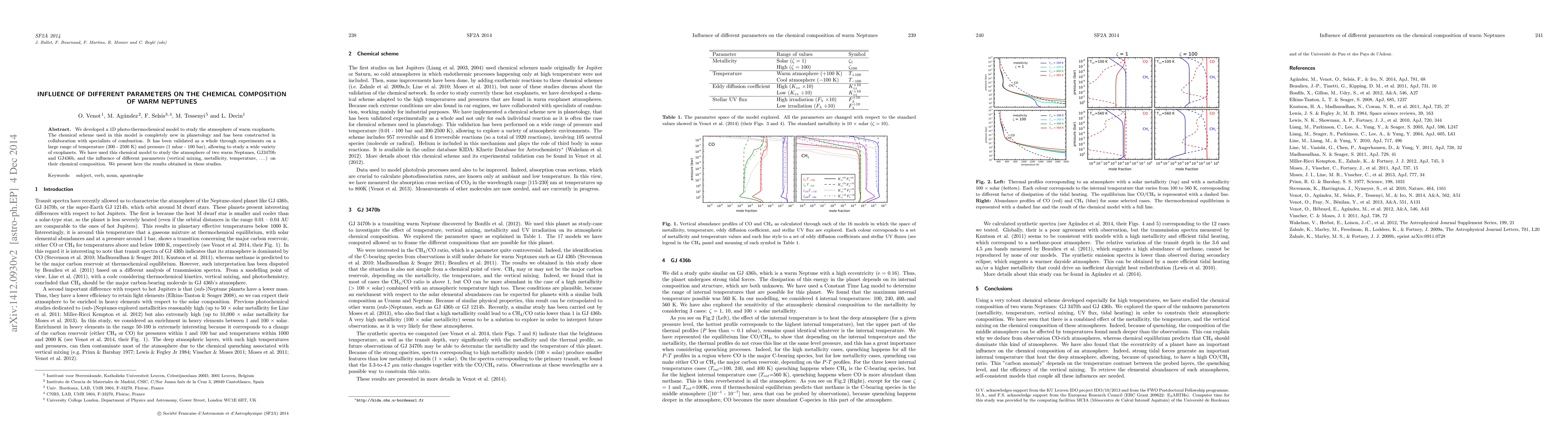 We developed a 1D photo-thermochemical model to study the atmosphere of warm exoplanets. The chemical scheme used in this model is completely new in planetology and has been constructed in collaboration with specialists of combustion. It has been validated as a whole through experiments on a large range of temperature (300 - 2500 K) and pressure (1 mbar - 100 bar), allowing to study a wide variety of exoplanets. We have used this chemical model to study the atmosphere of two warm Neptunes, GJ3470b and GJ436b, and the influence of different parameters (vertical mixing, metallicity, temperature, . . . ) on their chemical composition. We present here the results obtained in these studies.