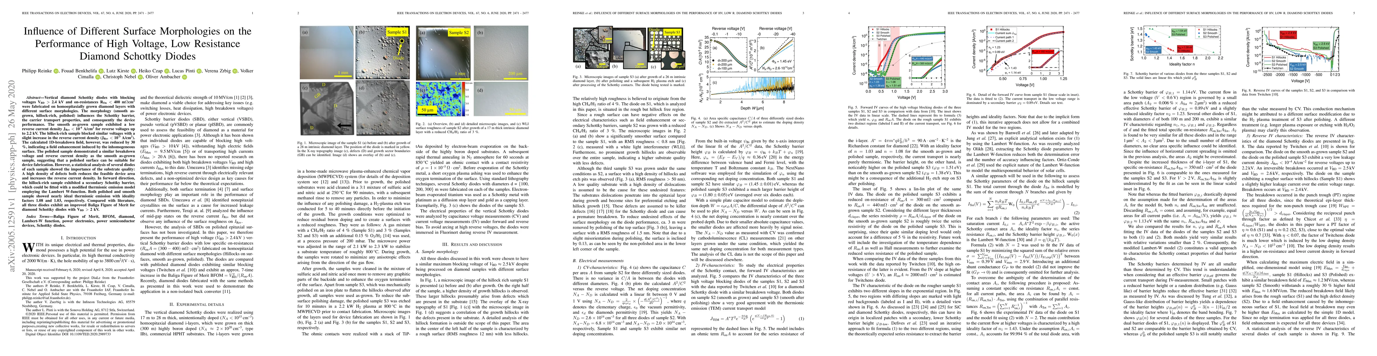 The research fabricated high-voltage, low-resistance diamond Schottky diodes on diamond layers with varying surface morphologies. Smooth as-grown surfaces yielded the lowest reverse current density, while hillock-rich surfaces had slightly higher current densities but still high breakdown voltages. Polished surfaces performed similarly to smooth ones, suggesting their suitability for device fabrication. Substrate quality was found crucial, with high defect densities reducing device area and increasing reverse current density. The study also revealed a secondary Schottky barrier in hillock-rich samples, fitting a modified thermionic emission model. All diodes showed improved Baliga Figure of Merit compared to previous literature.
