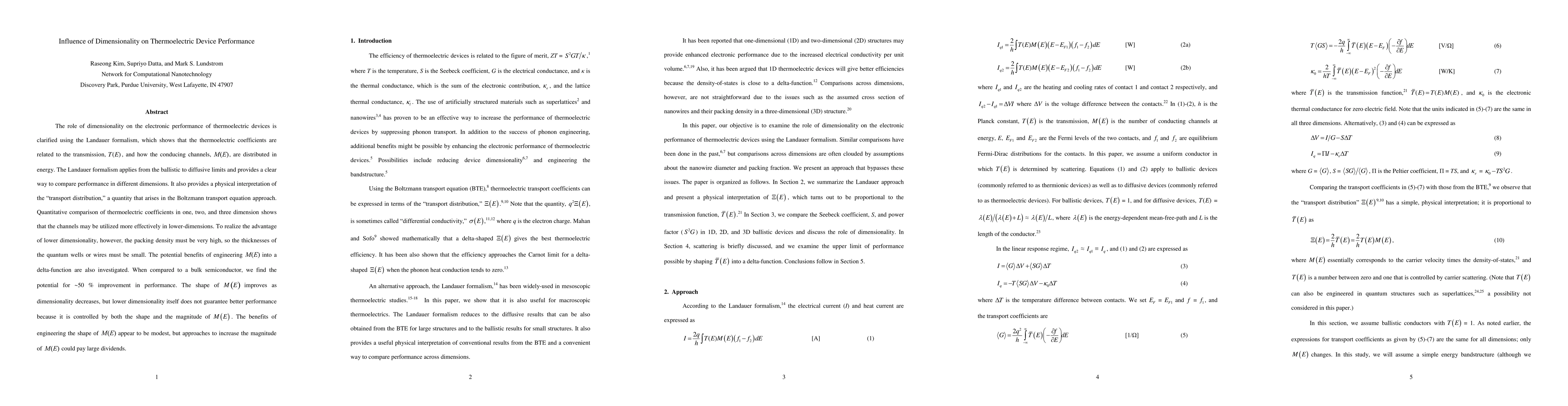 This paper uses the Landauer formalism to analyze how dimensionality affects thermoelectric device performance, revealing that lower-dimensional structures can utilize conducting channels more effectively. However, high packing density is required, and while shaping the energy distribution function M(E) offers modest benefits, enhancing its magnitude could significantly improve performance.