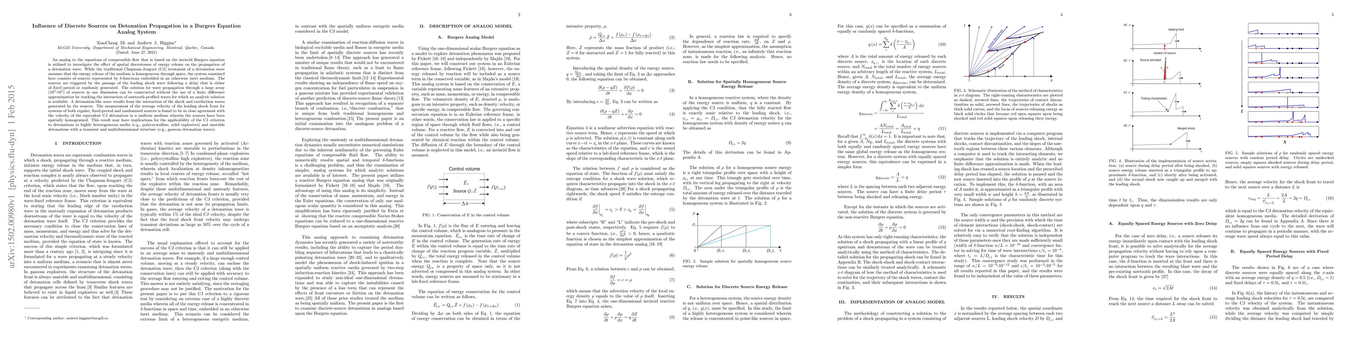 This study uses a Burgers equation analog to explore how discrete energy sources affect detonation wave propagation. It finds that despite the spatial discreteness of the sources, the average velocity of the leading shock front closely matches the Chapman-Jouguet criterion velocity for homogeneous media, suggesting the CJ criterion's applicability in heterogeneous media.