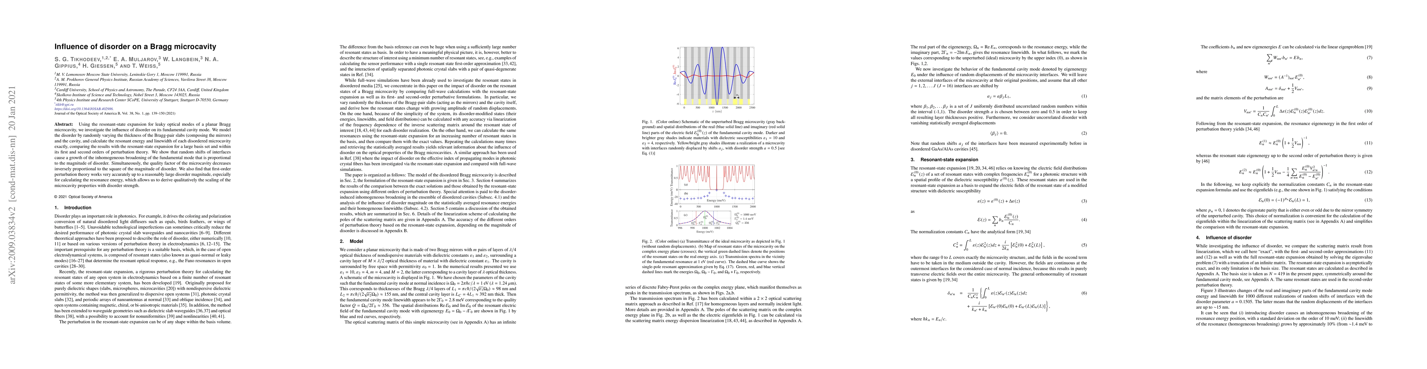 Using the resonant-state expansion for leaky optical modes of a planar Bragg microcavity, we investigate the influence of disorder on its fundamental cavity mode. We model the disorder by randomly varying the thickness of the Bragg-pair slabs (composing the mirrors) and the cavity, and calculate the resonant energy and linewidth of each disordered microcavity exactly, comparing the results with the resonant-state expansion for a large basis set and within its first and second orders of perturbation theory. We show that random shifts of interfaces cause a growth of the inhomogeneous broadening of the fundamental mode that is proportional to the magnitude of disorder. Simultaneously, the quality factor of the microcavity decreases inversely proportional to the square of the magnitude of disorder. We also find that first-order perturbation theory works very accurately up to a reasonably large disorder magnitude, especially for calculating the resonance energy, which allows us to derive qualitatively the scaling of the microcavity properties with disorder strength.
