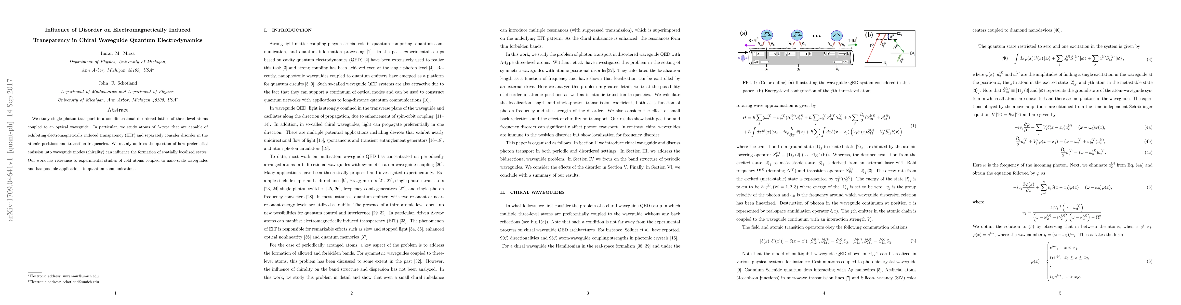 We study single photon transport in a one-dimensional disordered lattice of three-level atoms coupled to an optical waveguide. In particular, we study atoms of \Lambda-type that are capable of exhibiting electromagnetically induced transparency (EIT) and separately consider disorder in the atomic positions and transition frequencies. We mainly address the question of how preferential emission into waveguide modes (chirality) can influence the formation of spatially localized states. Our work has relevance to experimental studies of cold atoms coupled to nanoscale waveguides and has possible applications to quantum communications.