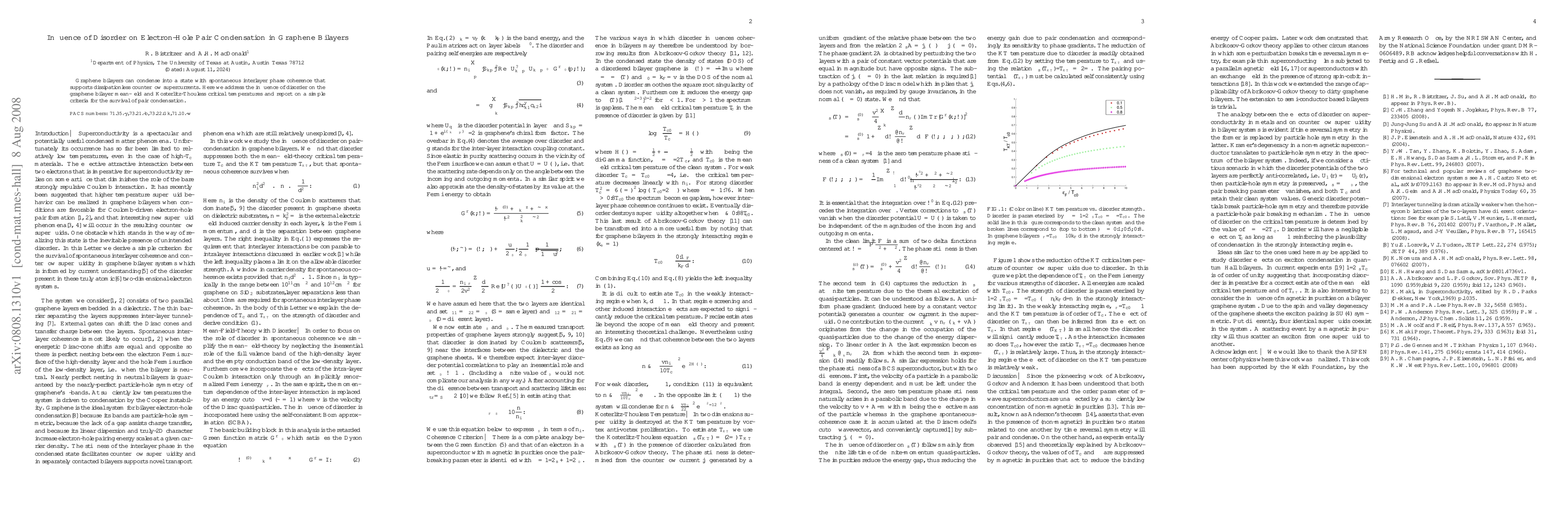 This paper investigates how disorder affects electron-hole pair condensation in graphene bilayers, finding that it influences both mean-field and Kosterlitz-Thouless critical temperatures, and proposes a criterion for the persistence of pair condensation despite disorder.
