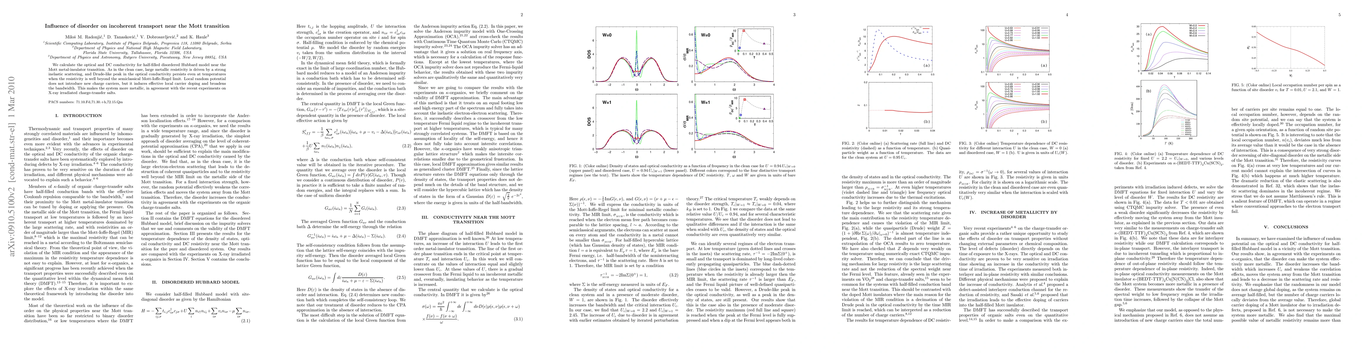 We calculate the optical and DC conductivity for half-filled disordered Hubbard model near the Mott metal-insulator transition. As in the clean case, large metallic resistivity is driven by a strong inelastic scattering, and Drude-like peak in the optical conductivity persists even at temperatures when the resistivity is well beyond the semiclassical Mott-Ioffe-Regel limit. Local random potential does not introduce new charge carriers, but it induces effective local carrier doping and broadens the bandwidth. This makes the system more metallic, in agreement with the recent experiments on X-ray irradiated charge-transfer salts.