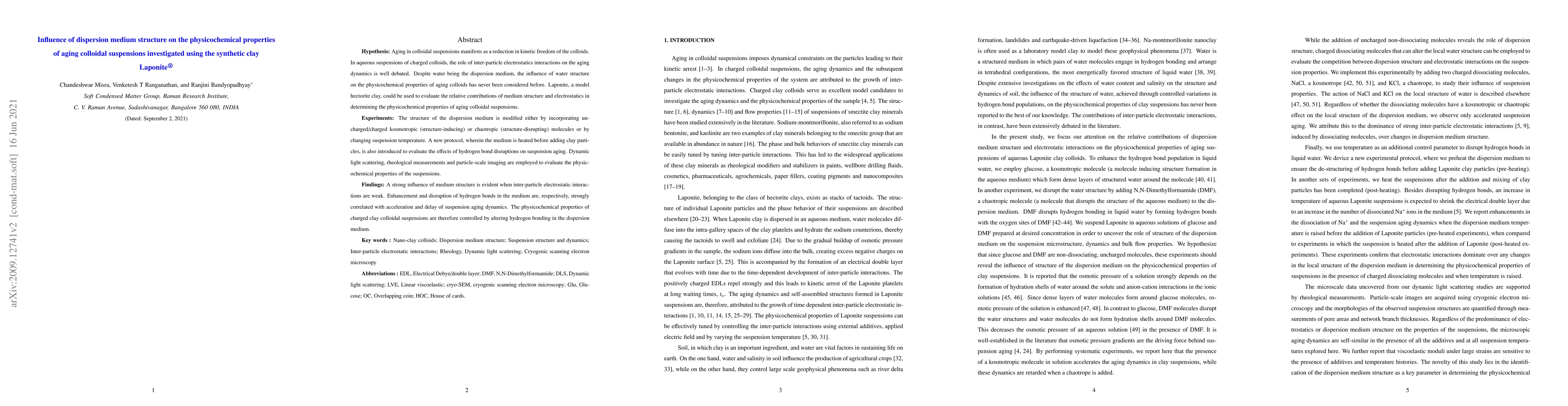 Hypothesis: Aging in colloidal suspensions manifests as a reduction in kinetic freedom of the colloids. In aqueous suspensions of charged colloids, the role of inter-particle electrostatics interactions on the aging dynamics is well debated. Despite water being the dispersion medium, the influence of water structure on the physicochemical properties of aging colloids has never been considered before. Laponite, a model hectorite clay, could be used to evaluate the relative contributions of medium structure and electrostatics in determining the physicochemical properties of aging colloidal suspensions. Experiments: The structure of the dispersion medium is modified either by incorporating uncharged/charged kosmotropic (structure-inducing) or chaotropic (structure-disrupting) molecules or by changing suspension temperature. A new protocol, wherein the medium is heated before adding clay particles, is also introduced to evaluate the effects of hydrogen bond disruptions on suspension aging. Dynamic light scattering, rheological measurements and particle-scale imaging are employed to evaluate the physicochemical properties of the suspensions. Findings: A strong influence of medium structure is evident when inter-particle electrostatic interactions are weak. Enhancement and disruption of hydrogen bonds in the medium are, respectively, strongly correlated with acceleration and delay of suspension aging dynamics. The physicochemical properties of charged clay colloidal suspensions are therefore controlled by altering hydrogen bonding in the dispersion medium.