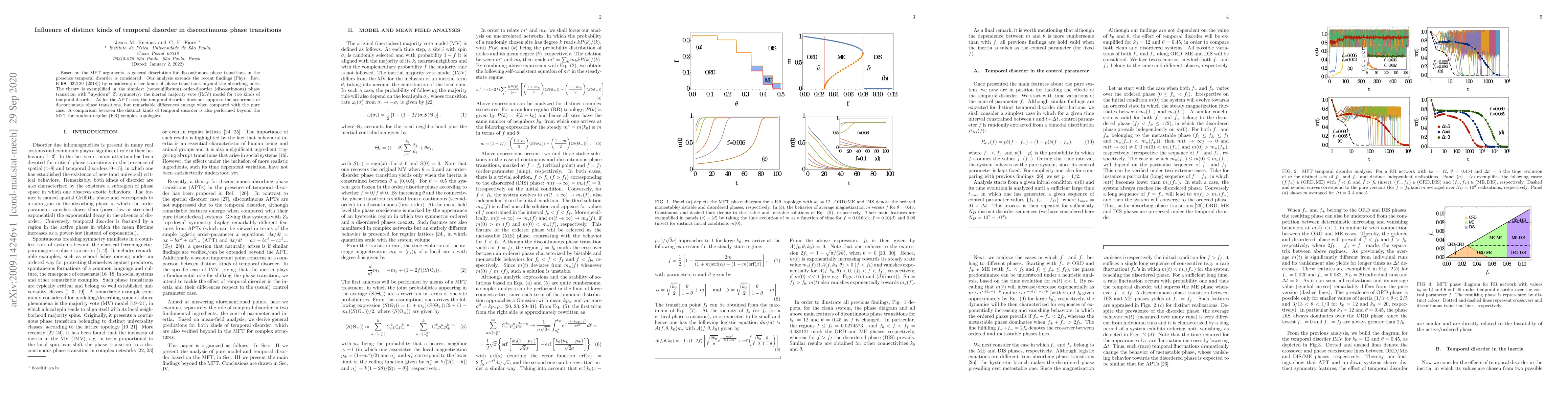 This paper explores the impact of various types of temporal disorder on discontinuous phase transitions using mean-field theory (MFT) and random-regular (RR) complex topologies. It finds that temporal disorder does not prevent these transitions but introduces significant differences compared to the pure cases, particularly in the inertial majority vote model.