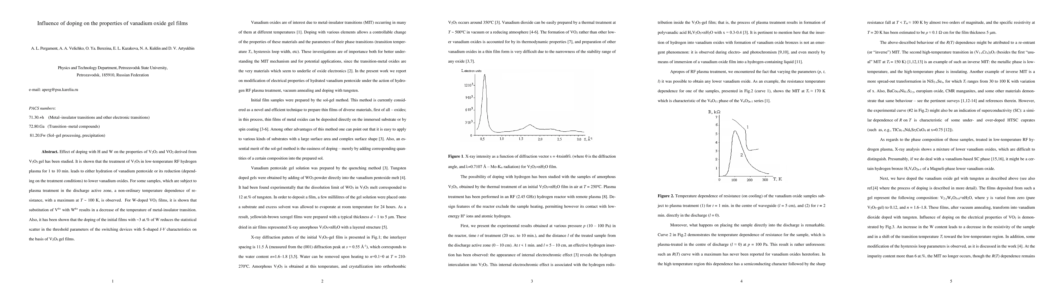 Researchers investigated the effect of hydrogen and tungsten doping on vanadium oxide gel films, revealing a non-ordinary temperature dependence of resistance in some samples and a decrease in metal-insulator transition temperature with tungsten substitution.