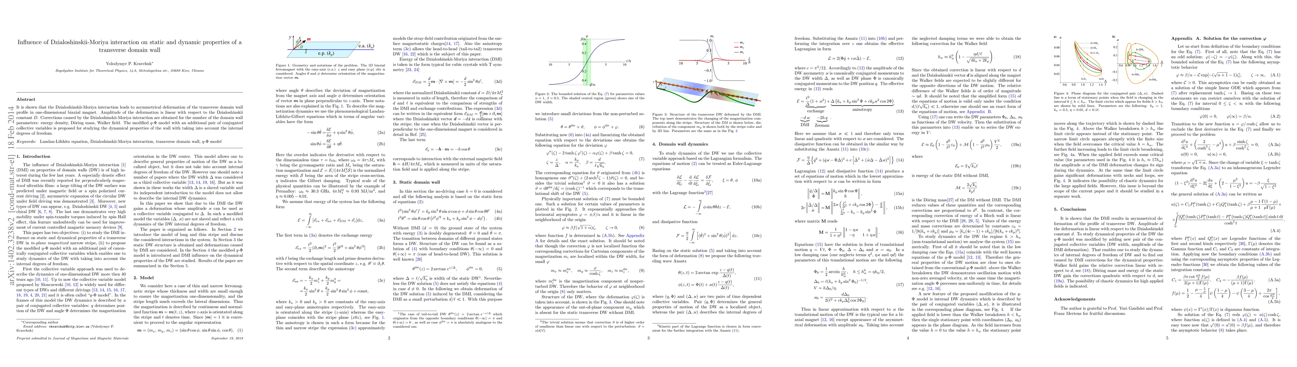 The Dzialoshinskii-Moriya interaction asymmetrically deforms the transverse domain wall in a biaxial magnet, with deformation amplitude linearly proportional to the Dzialoshinskii constant $D$. The interaction also modifies domain wall parameters like energy density and Walker field, and a new $q$-$\Phi$ model is proposed to study its dynamic properties.