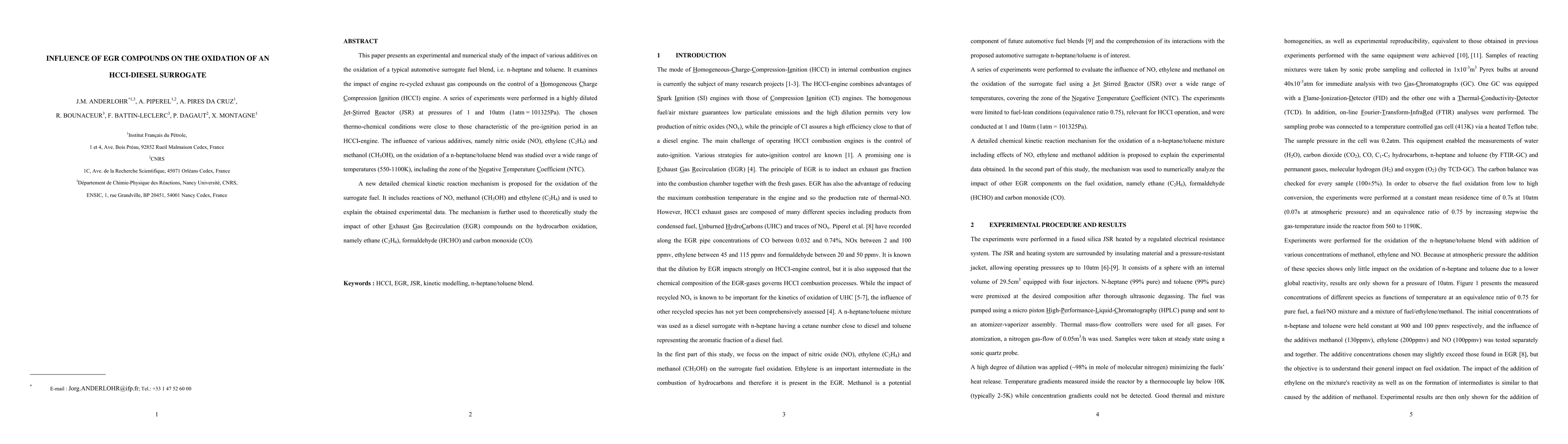 This paper presents an experimental and numerical study of the impact of various additives on the oxidation of a typical automotive surrogate fuel blend, i.e. n-heptane and toluene. It examines the impact of engine re-cycled exhaust has compounds on the control of an Homogeneous Charge Compression-Ignition (HCCI) engine. Series of experiments were performed in a hihly diluted Jet-Stirred Reactor (JDR) at pressures of 1 and 10 atm (1 atm = 101,325 Pa). The chosen thermo-chemical conditions were close to those characteristices of the pre-ignition period in an HCCI engine. The influence of various additives, namely nitric oxide (NO), ethylene (C2H4) and methanol (CH3OH), on the oxidation of a n-heptane/toluene blend was studied over a wide range of temperatures (550-1100 K), including the zone of the Negative Temperature Coefficient (NTC).