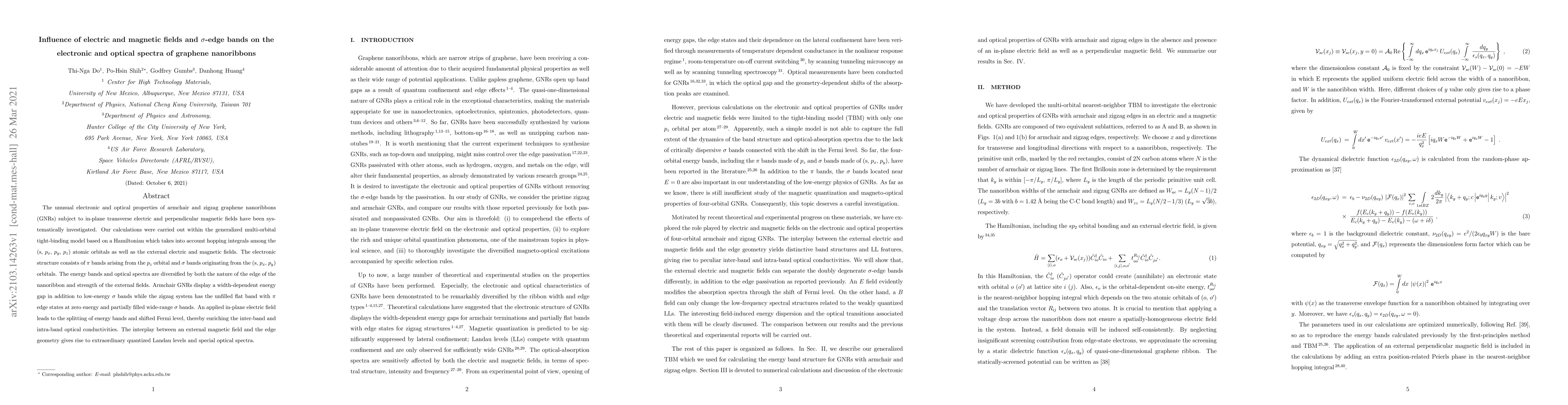 The unusual electronic and optical properties of armchair and zigzag graphene nanoribbons (GNRs) subject to in-plane transverse electric and perpendicular magnetic fields have been systematically investigated. Our calculations were carried out within the generalized multi-orbital tight-binding model based on a Hamiltonian which takes into account hopping integrals among the (s, $p_x$, $p_y$, $p_z$) atomic orbitals as well as the external electric and magnetic fields. The electronic structure consists of $\pi$ bands arising from the $p_z$ orbital and $\sigma$ bands originating from the (s, $p_x$, $p_y$) orbitals. The energy bands and optical spectra are diversified by both the nature of the edge of the nanoribbon and strength of the external fields. Armchair GNRs display a width-dependent energy gap in addition to low-energy $\sigma$ bands while the zigzag system has the unfilled flat band with $\pi$ edge states at zero energy and partially filled wide-range $\sigma$ bands. An applied in-plane electric field leads to the splitting of energy bands and shifted Fermi level, thereby enriching the inter-band and intra-band optical conductivities. The interplay between an external magnetic field and the edge geometry gives rise to extraordinary quantized Landau levels and special optical spectra.