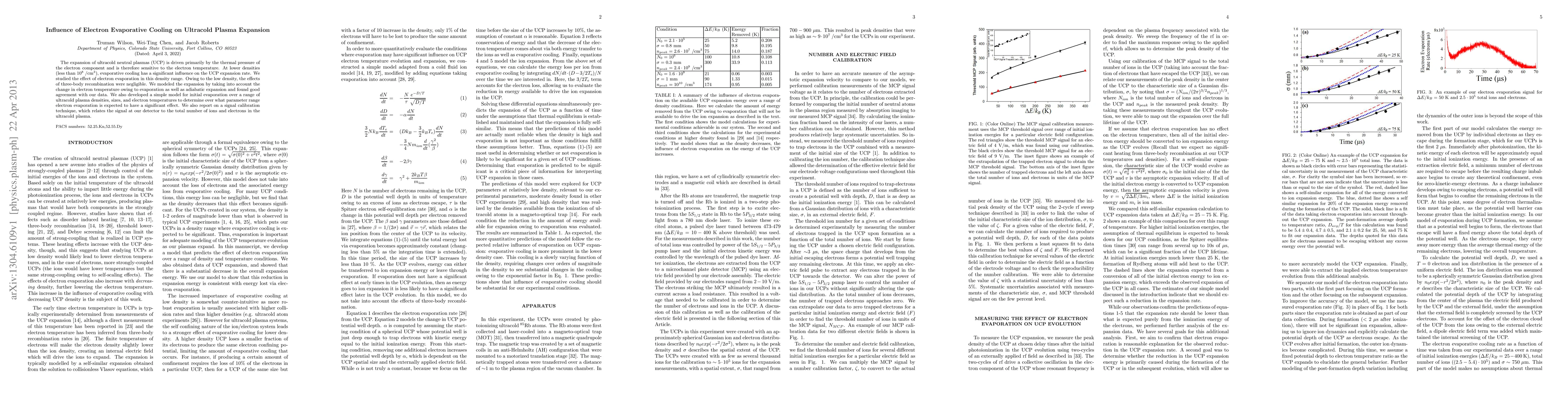 The expansion of ultracold neutral plasmas (UCP) is driven primarily by the thermal pressure of the electron component and is therefore sensitive to the electron temperature. At lower densities (less than 10$^8$ /cm$^3$), evaporative cooling has a significant influence on the UCP expansion rate. We studied the effect of electron evaporation in this density range. Owing to the low density, the effects of three-body recombination were negligible. We modeled the expansion by taking into account the change in electron temperature owing to evaporation as well as adiabatic expansion and found good agreement with our data. We also developed a simple model for initial evaporation over a range of ultracold plasma densities, sizes, and electron temperatures to determine over what parameter range electron evaporation is expected to have a significant effect. We also report on a signal calibration technique, which relates the signal at our detector to the total number of ions and electrons in the ultracold plasma.