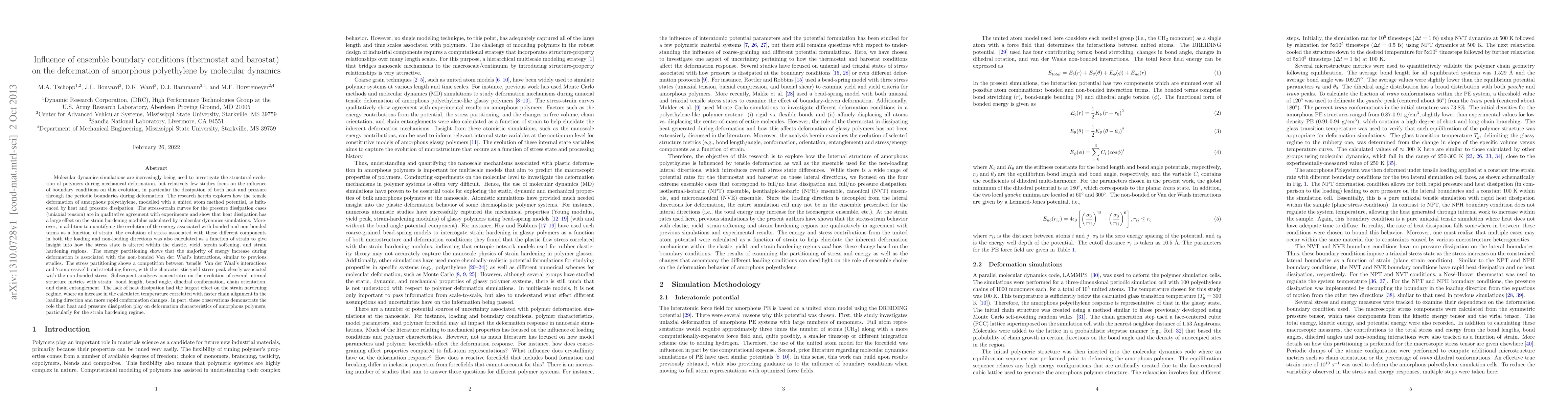 Molecular dynamics simulations are increasingly being used to investigate the structural evolution of polymers during mechanical deformation, but relatively few studies focus on the influence of boundary conditions on this evolution, in particular the dissipation of both heat and pressure through the periodic boundaries during deformation. The research herein explores how the tensile deformation of amorphous polyethylene, modelled with a united atom method potential, is influenced by heat and pressure dissipation. The stress-strain curves for the pressure dissipation cases (uniaxial tension) are in qualitative agreement with experiments and show that heat dissipation has a large effect on the strain hardening modulus calculated by molecular dynamics simulations. The evolution of the energy associated with bonded and non-bonded terms was quantified as a function of strain as well as the evolution of stress in both the loading and non-loading directions to give insight into how the stress state is altered within the elastic, yield, strain softening, and strain hardening regions. The stress partitioning shows a competition between `tensile' Van der Waal's interactions and `compressive' bond stretching forces, with the characteristic yield stress peak clearly associated with the non-bonded stress. The lack of heat dissipation had the largest effect on the strain hardening regime, where an increase in the calculated temperature correlated with faster chain alignment in the loading direction and more rapid conformation changes. In part, these observations demonstrate the role that heat and pressure dissipation play on deformation characteristics of amorphous polymers, particularly for the strain hardening regime.