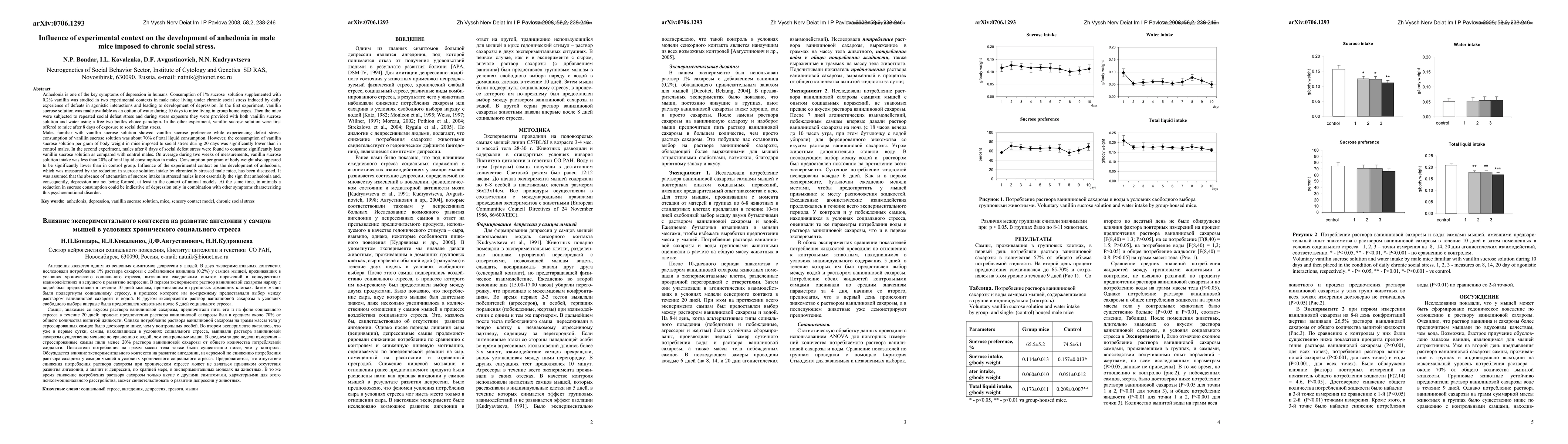 This study investigates the influence of experimental context on anhedonia development in male mice subjected to chronic social stress. Mice showed preference for vanillin sucrose solution but experienced significant reductions in consumption when stressed, with the context of sucrose availability prior to stress affecting the severity of anhedonia.