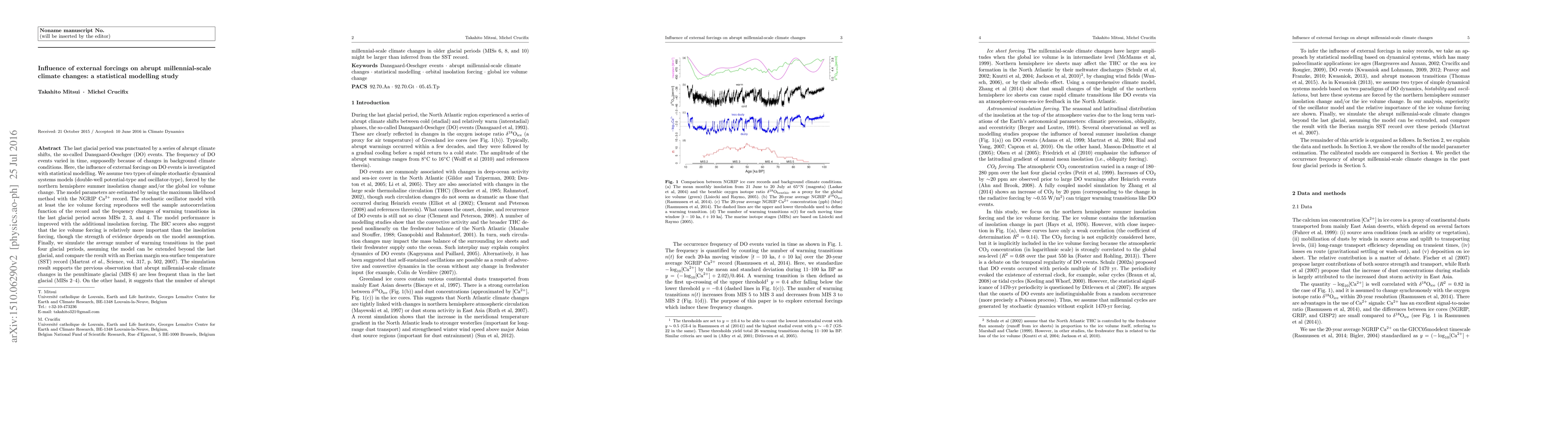 This study investigates the influence of external forcings on abrupt Dansgaard-Oeschger climate events during the last glacial period using statistical models. The results suggest that ice volume changes are more significant than insolation changes in driving these events, with the model performance improving when both forcings are included.