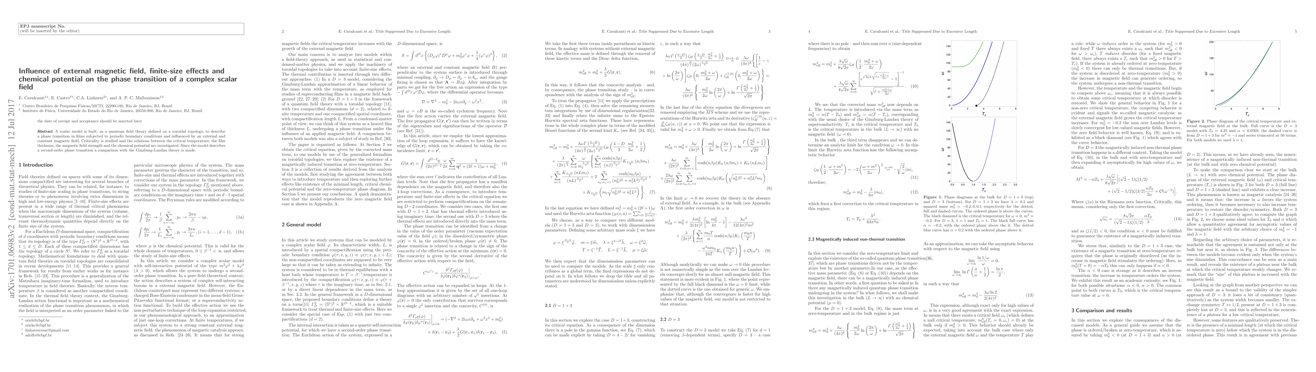 This paper constructs a scalar field model on toroidal topologies to study phase transitions in thin films under periodic boundary conditions, influenced by an external magnetic field. It examines the relationships between critical temperature, film thickness, magnetic field strength, and chemical potential, comparing findings to the Ginzburg-Landau theory for second-order phase transitions.