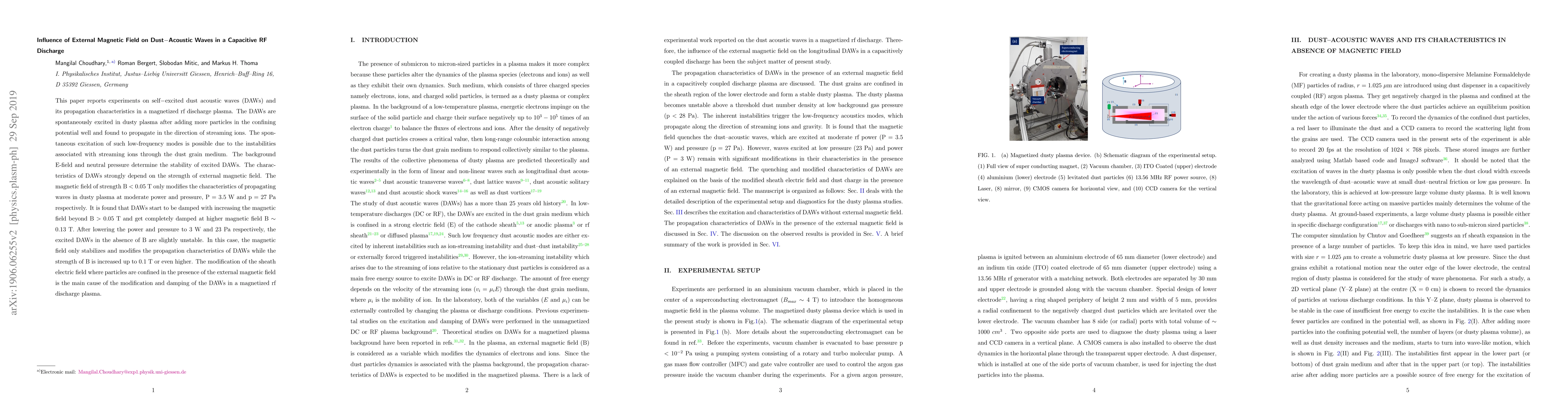 This paper investigates the influence of external magnetic fields on dust-acoustic waves (DAWs) in a capacitive RF discharge plasma. It finds that DAWs are modified and damped at magnetic field strengths above 0.05 T, while lower fields stabilize and alter their propagation characteristics.