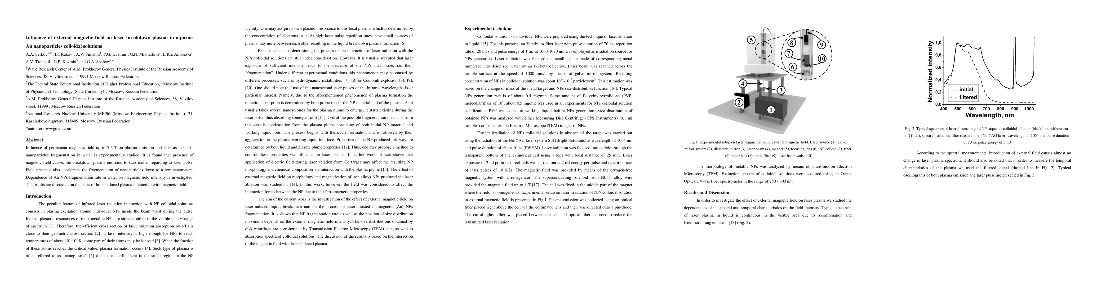 Influence of permanent magnetic field up to 7.5 T on plasma emission and laser-assisted Au nanoparticles fragmentation in water is experimentally studied. It is found that presence of magnetic field causes the breakdown plasma emission to start earlier regarding to laser pulse. Field presence also accelerates the fragmentation of nanoparticles down to a few nanometers. Dependence of Au NPs fragmentation rate in water on magnetic field intensity is investigated. The results are discussed on the basis of laser-induced plasma interaction with magnetic field.