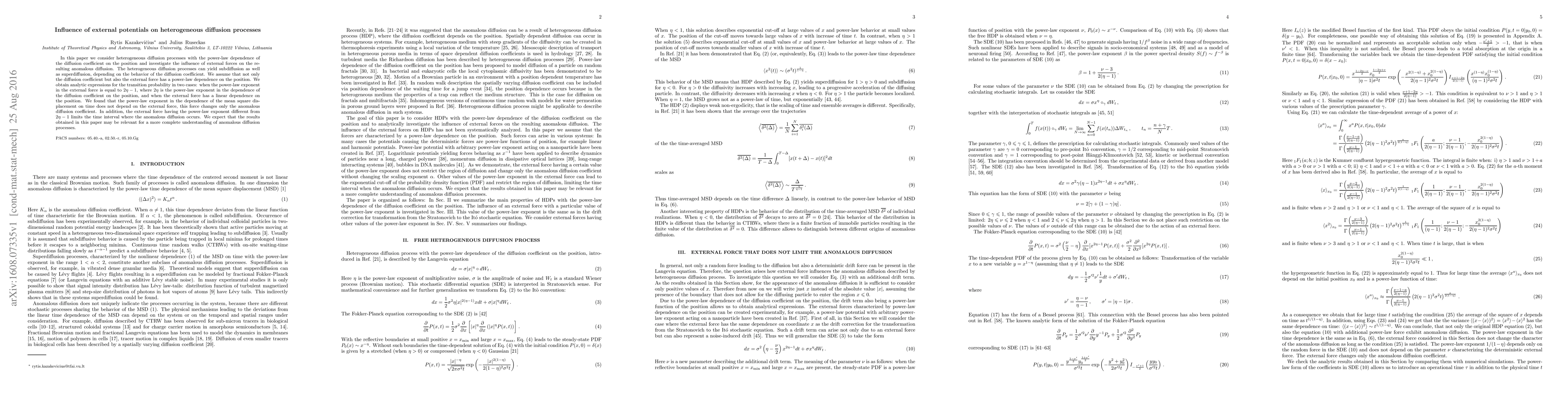 In this paper we consider heterogeneous diffusion processes with the power-law dependence of the diffusion coefficient on the position and investigate the influence of external forces on the resulting anomalous diffusion. The heterogeneous diffusion processes can yield subdiffusion as well as superdiffusion, depending on the behavior of the diffusion coefficient. We assume that not only the diffusion coefficient but also the external force has a power-law dependence on the position. We obtain analytic expressions for the transition probability in two cases: when the power-law exponent in the external force is equal to 2eta-1, where 2eta is the power-law exponent in the dependence of the diffusion coefficient on the position, and when the external force has a linear dependence on the position. We found that the power-law exponent in the dependence of the mean square displacement on time does not depend on the external force, this force changes only the anomalous diffusion coefficient. In addition, the external force having the power-law exponent different from 2eta-1 limits the time interval where the anomalous diffusion occurs. We expect that the results obtained in this paper may be relevant for a more complete understanding of anomalous diffusion processes.