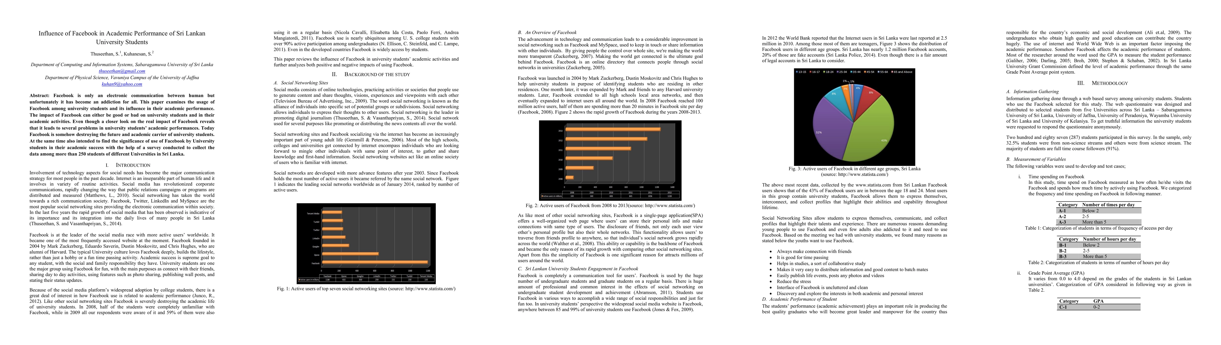 This study investigates the impact of Facebook usage on the academic performance of Sri Lankan university students, revealing both positive and negative influences. The research, based on a survey of over 250 students, finds that excessive Facebook use often leads to detrimental effects on academic success.