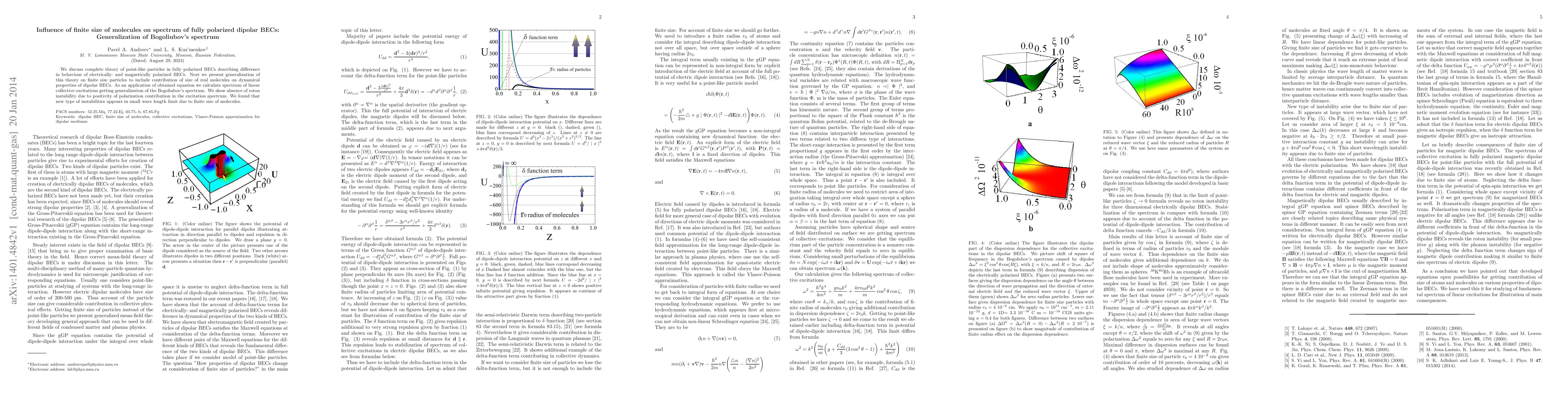 We discuss complete theory of point-like particles in fully polarized BECs describing difference in behaviour of electrically- and magnetically polarized BECs. Next we present generalization of this theory on finite size particles to include contribution of size of real molecules on dynamical properties of dipolar BECs. As an application of obtained equation we calculate spectrum of linear collective excitations getting generalization of the Bogoliubov's spectrum. We show absence of roton instability due to positivity of polarization contribution in the excitation spectrum. We found that new type of instabilities appears in small wave length limit due to finite size of molecules.