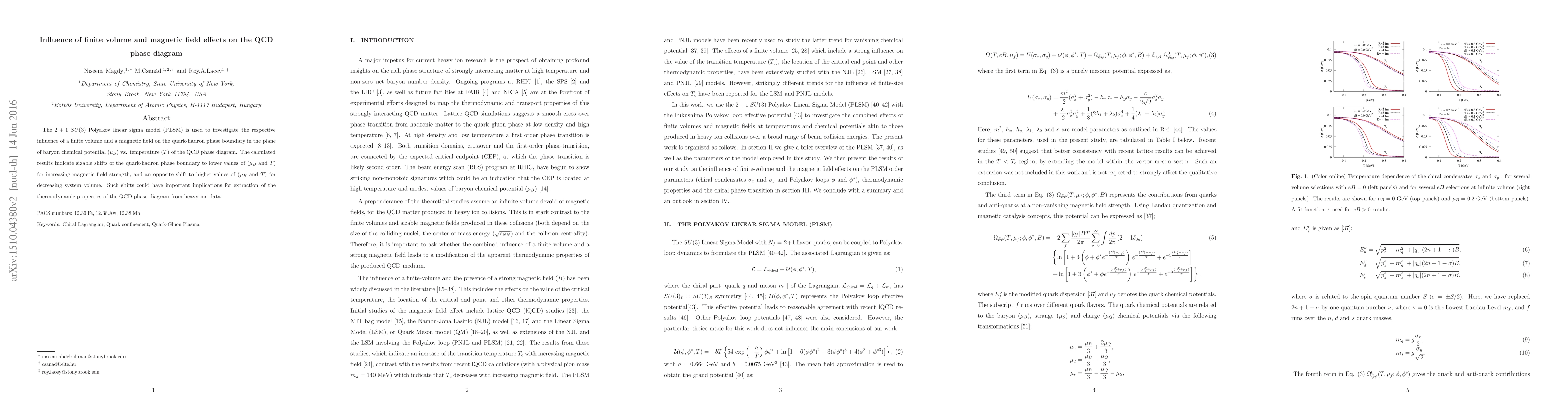 The Polyakov linear sigma model reveals the impact of finite volume and magnetic fields on the QCD phase boundary, showing shifts in the quark-hadron phase boundary to lower $(\mu_{B}, T)$ values with stronger magnetic fields and higher values with smaller volumes. These findings have significant implications for interpreting QCD phase diagram properties from heavy ion collision data.