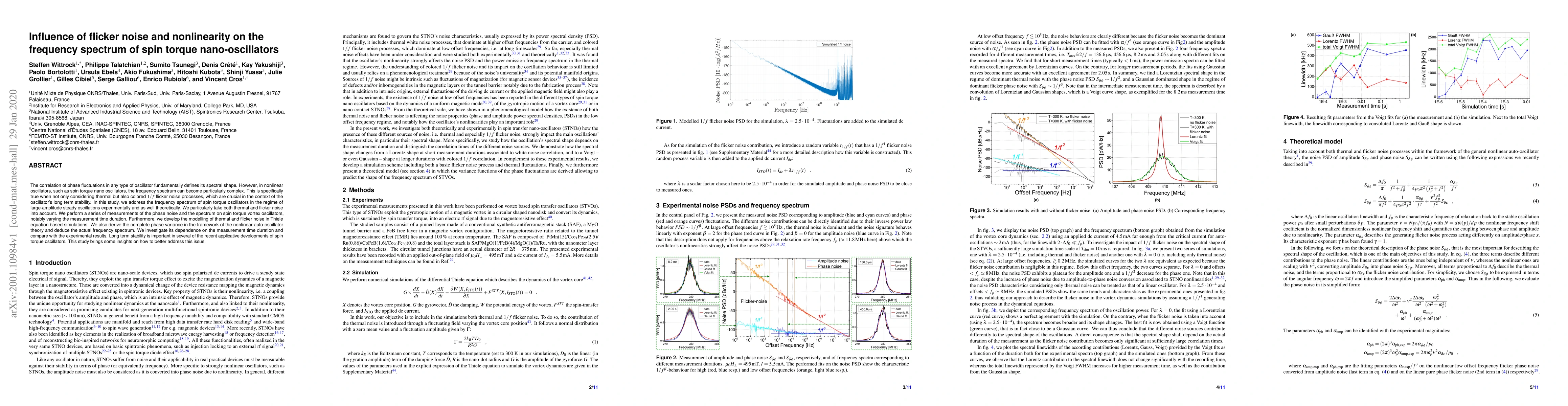 This paper investigates the influence of thermal and flicker noise on the frequency spectrum of spin torque nano-oscillators, particularly focusing on their long-term stability. Both experimental and theoretical approaches are used to model and analyze the phase noise and spectrum, revealing insights into improving the oscillator's stability.