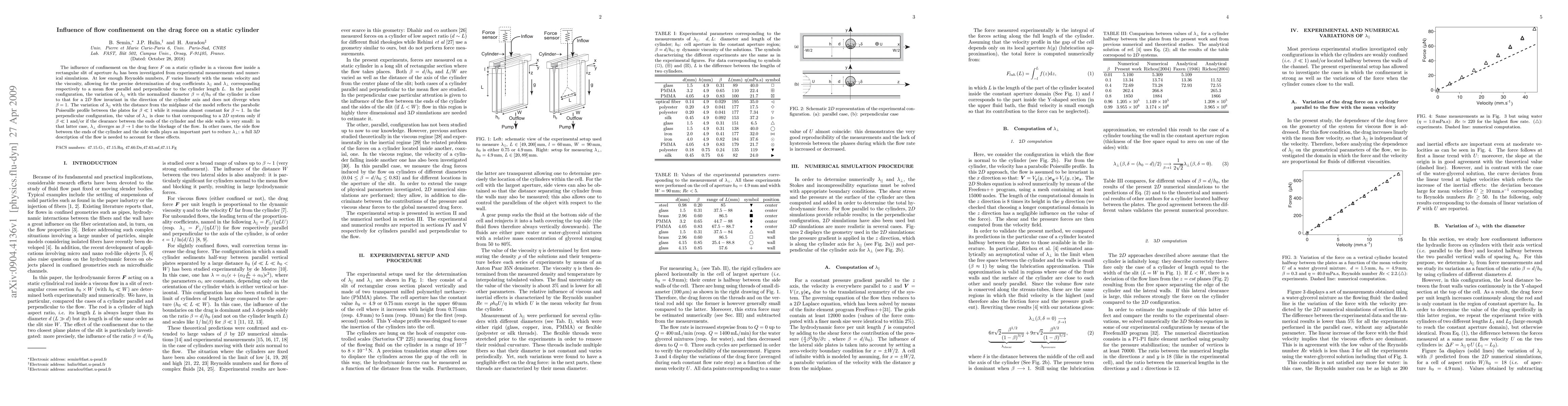 The influence of confinement on the drag force $F$ on a static cylinder in a viscous flow inside a rectangular slit of aperture $h_0$ has been investigated from experimental measurements and numerical simulations. At low enough Reynolds numbers, $F$ varies linearly with the mean velocity and the viscosity, allowing for the precise determination of drag coefficients $\lambda_{||}$ and $\lambda_{\bot}$ corresponding respectively to a mean flow parallel and perpendicular to the cylinder length $L$. In the parallel configuration, the variation of $\lambda_{||}$ with the normalized diameter $\beta = d/h_0$ of the cylinder is close to that for a 2D flow invariant in the direction of the cylinder axis and does not diverge when $\beta = 1$. The variation of $\lambda_{||}$ with the distance from the midplane of the model reflects the parabolic Poiseuille profile between the plates for $\beta \ll 1$ while it remains almost constant for $\beta \sim 1$. In the perpendicular configuration, the value of $\lambda_{\bot}$ is close to that corresponding to a 2D system only if $\beta \ll 1$ and/or if the clearance between the ends of the cylinder and the side walls is very small: in that latter case, $\lambda_{\bot}$ diverges as $\beta \to 1$ due to the blockage of the flow. In other cases, the side flow between the ends of the cylinder and the side walls plays an important part to reduce $\lambda_{\bot}$: a full 3D description of the flow is needed to account for these effects.