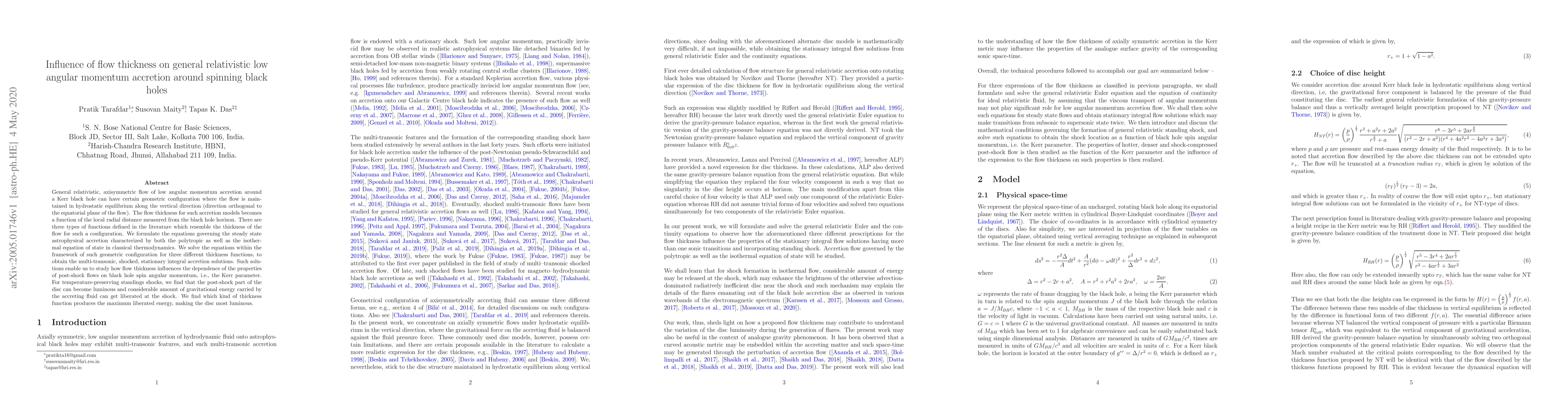 This paper investigates the influence of flow thickness on low angular momentum accretion around spinning black holes, solving the equations for three different thickness functions to determine how flow geometry affects the properties of post-shock flows and the liberation of gravitational energy. The study finds that certain thickness functions can maximize the luminosity of the disc and the energy released at shocks.
