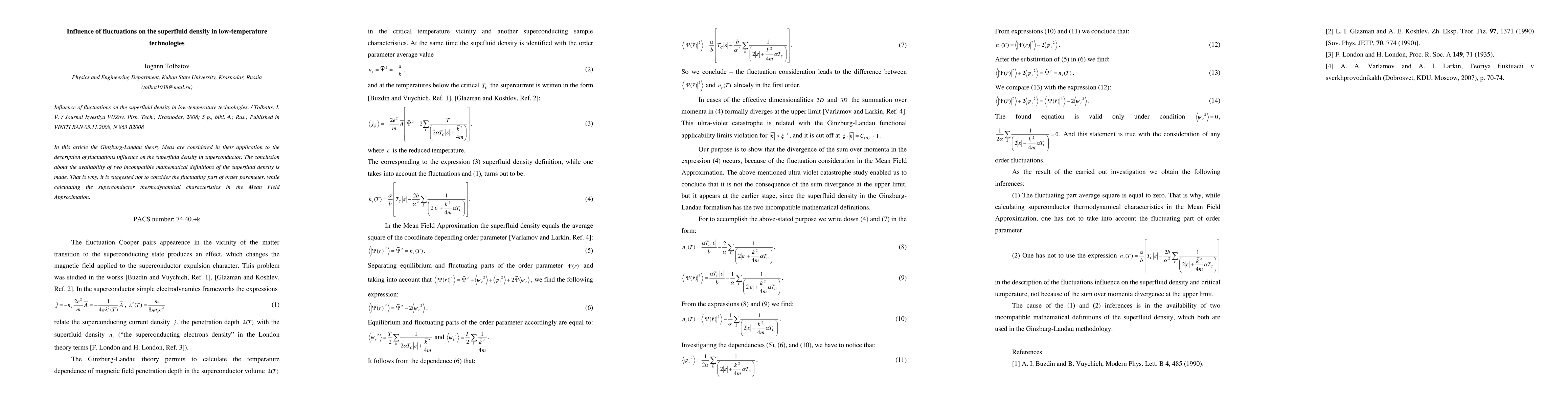 In this article the Ginzburg-Landau theory ideas are considered in their application to the description of fluctuations influence on the superfluid density in superconductor. The conclusion about the availability of two incompatible mathematical definitions of the superfluid density is made. That is why, it is suggested not to consider the fluctuating part of order parameter, while calculating the superconductor thermodynamical characteristics in the Mean Field Approximation.