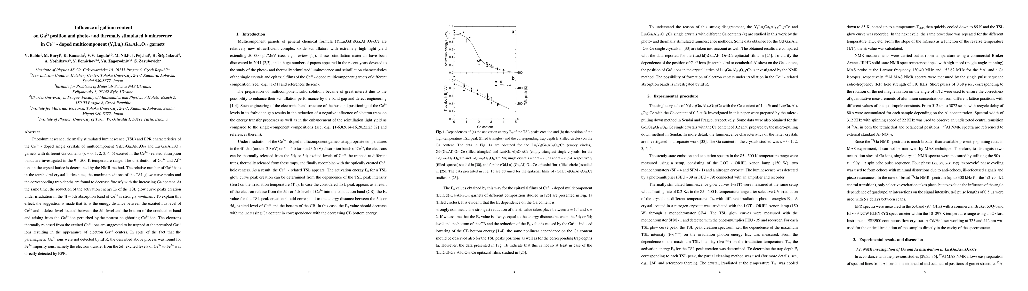 Photoluminescence, thermally stimulated luminescence (TSL) and EPR characteristics of the Ce3+ doped single crystals of multicomponent Y1Lu2GaxAl5-xO12 and Lu3GaxAl5-xO12 garnets with different Ga contents (x = 0, 1, 2, 3, 4, 5) excited in the Ce3+ - related absorption bands are investigated in the 9 - 500 K temperature range. The distribution of Ga3+ and Al3+ ions in the crystal lattice is determined by the NMR method. The relative number of Ga3+ ions in the tetrahedral crystal lattice sites, the maxima positions of the TSL glow curve peaks and the corresponding trap depths are found to decrease linearly with the increasing Ga content. At the same time, the reduction of the activation energy Ea of the TSL glow curve peaks creation under irradiation in the 4f - 4d1 absorption band of Ce3+ is strongly nonlinear. To explain this effect, the suggestion is made that Ea is the energy distance between the excited 5d1 level of Ce3+ and a defect level located between the 5d1 level and the bottom of the conduction band and arising from the Ga3+ ion perturbed by the nearest neighboring Ce3+ ion. The electrons thermally released from the excited Ce3+ ions are suggested to be trapped at the perturbed Ga3+ ions resulting in the appearance of electron Ga2+ centers. In spite of the fact that the paramagnetic Ga2+ ions were not detected by EPR, the described above process was found for Fe3+ impurity ions, namely the electron transfer from the 5d1 excited levels of Ce3+ to Fe3+ was directly detected by EPR.