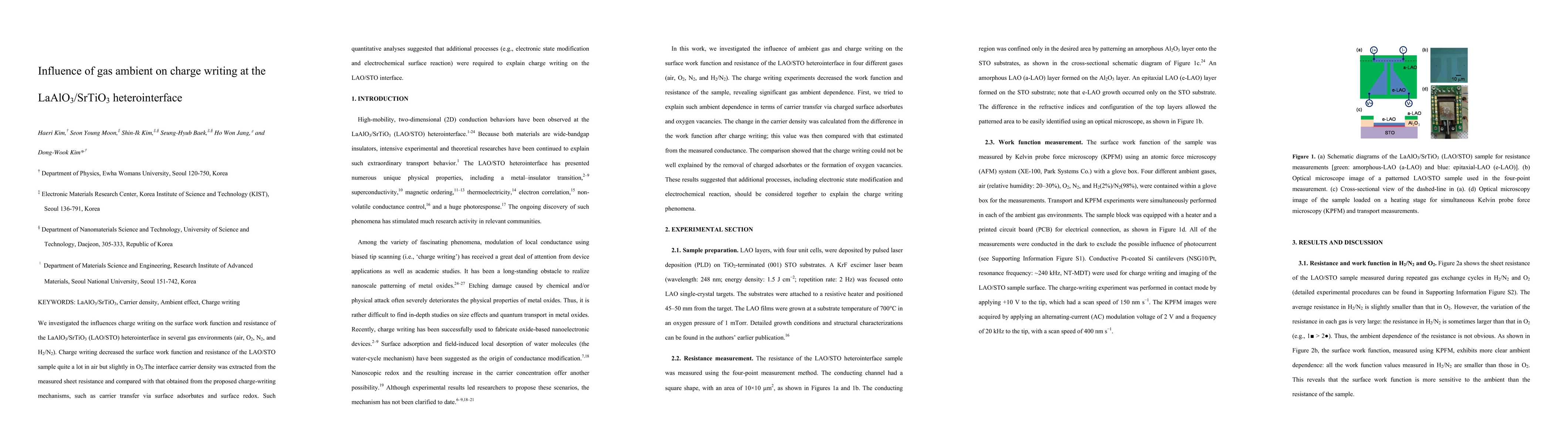 This study examines how different ambient gases (air, O2, N2, and H2/N2) affect charge writing on the LaAlO3/SrTiO3 heterointerface, finding significant reductions in surface work function and resistance in air but minimal changes in O2. Proposed charge-writing mechanisms were insufficient, indicating additional processes like electronic state modification and electrochemical reactions are needed.