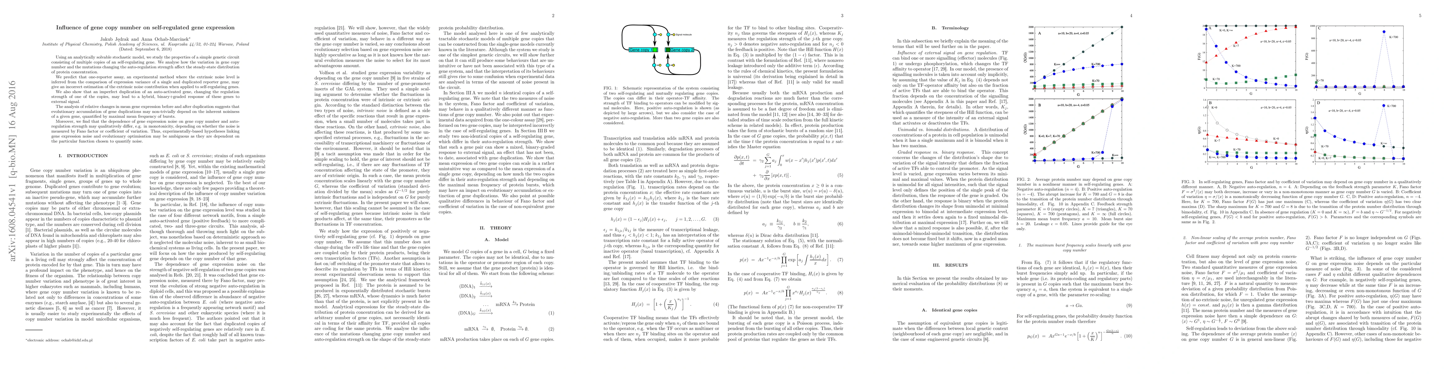 Using an analytically solvable stochastic model, we study the properties of a simple genetic circuit consisting of multiple copies of an self-regulating gene. We analyse how the variation in gene copy number and the mutations changing the auto-regulation strength affect the steady-state distribution of protein concentration. We predict that one-reporter assay, an experimental method where the extrinsic noise level is inferred from the comparison of expression variance of a single and duplicated reporter gene, may give an incorrect estimation of the extrinsic noise contribution when applied to self-regulating genes. We also show that an imperfect duplication of an auto-activated gene, changing the regulation strength of one of the copies, may lead to a hybrid, binary+graded response of these genes to external signal. The analysis of relative changes in mean gene expression before and after duplication suggests that evolutionary accumulation of gene duplications may non-trivially depend on the inherent noisiness of a given gene, quantified by maximal mean frequency of bursts. Moreover, we find that the dependence of gene expression noise on gene copy number and auto-regulation strength may qualitatively differ, e.g. in monotonicity, depending on whether the noise is measured by Fano factor or coefficient of variation. Thus, experimentally-based hypotheses linking gene expression noise and evolutionary optimisation may be ambiguous as they are dependent on the particular function chosen to quantify noise.