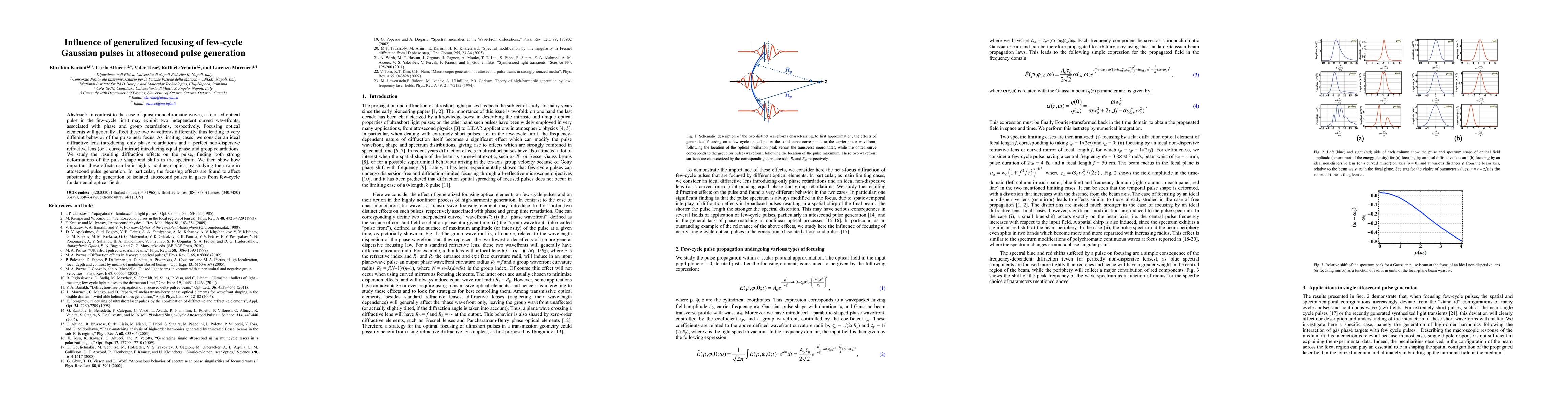 This paper explores the influence of generalized focusing on few-cycle Gaussian pulses, revealing significant deformations and spectral shifts due to differing wavefront interactions with focusing elements. These effects are crucial in attosecond pulse generation, particularly affecting the production of isolated attosecond pulses in gases.