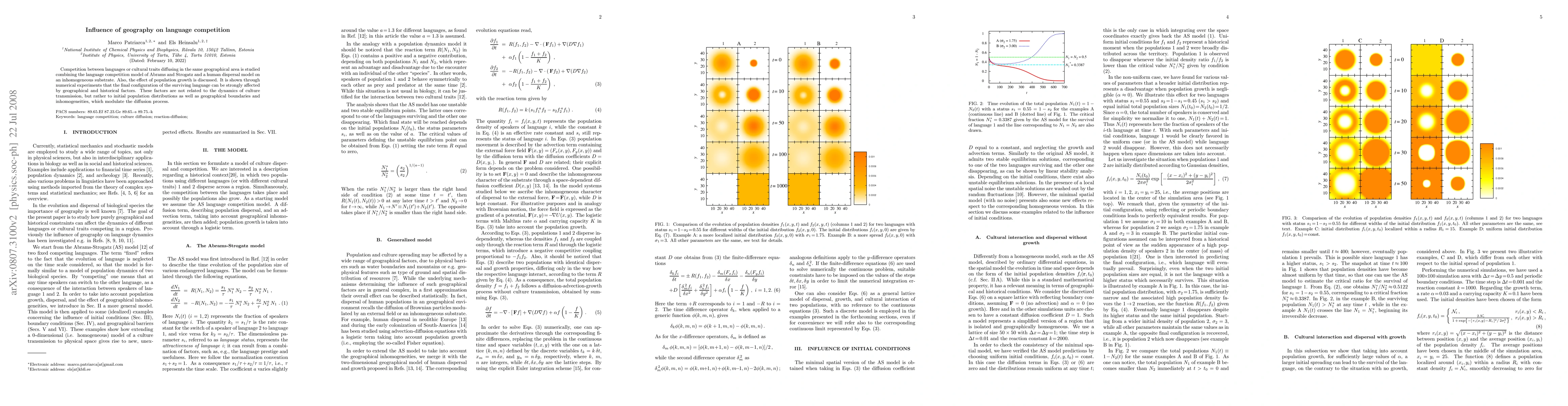 A study examines how geography affects language competition, showing that geographical boundaries and population distributions can significantly influence the outcome of language diffusion. Numerical experiments demonstrate the impact of these factors on the final configuration of surviving languages.