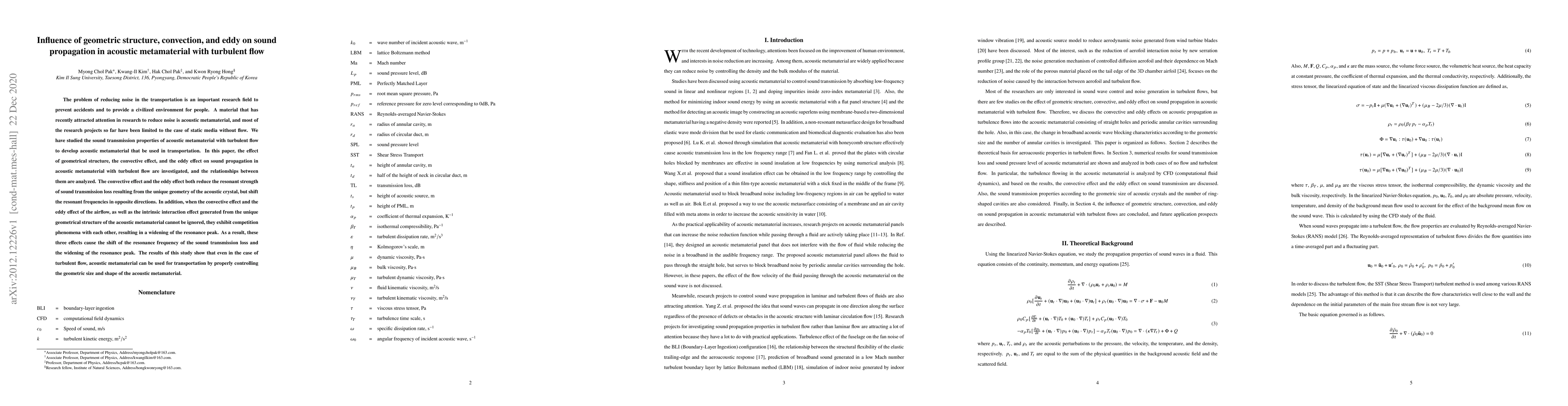 This paper investigates how geometric structure, convection, and eddy effects influence sound propagation in acoustic metamaterials with turbulent flow, revealing that these factors shift resonant frequencies and widen resonance peaks. Proper control of the metamaterial's geometry can still enable its use in transportation noise reduction despite turbulent flow.