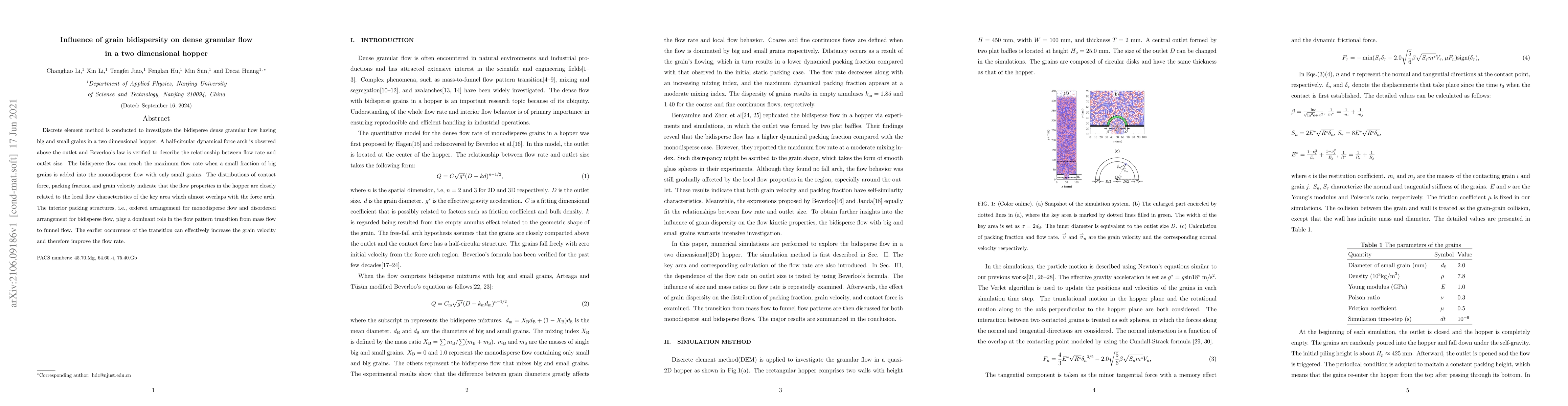 This study uses the discrete element method to explore bidisperse dense granular flow in a two-dimensional hopper, finding that a small fraction of big grains enhances flow rate. The transition from mass to funnel flow is influenced by interior packing structures, improving flow dynamics.
