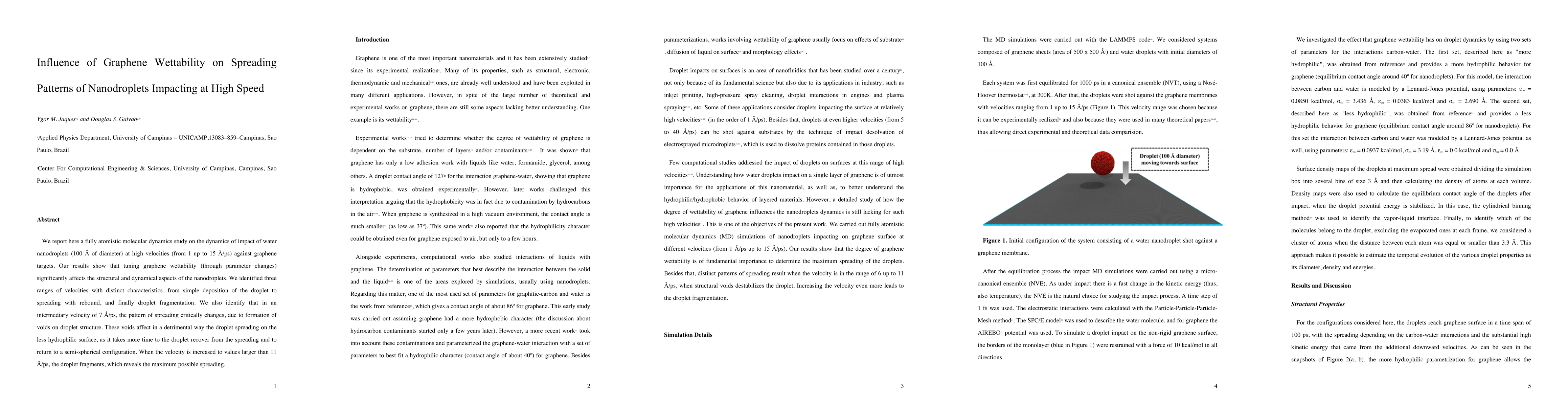 We report here a fully atomistic molecular dynamics study on the dynamics of impact of water nanodroplets (100 {\AA} of diameter) at high velocities (from 1 up to 15 {\AA}/ps) against graphene targets. Our results show that tuning graphene wettability (through parameter changes) significantly affects the structural and dynamical aspects of the nanodroplets. We identified three ranges of velocities with distinct characteristics, from simple deposition of the droplet to spreading with rebound, and finally droplet fragmentation. We also identify that in an intermediary velocity of 7 {\AA}/ps, the pattern of spreading critically changes, due to formation of voids on droplet structure. These voids affect in a detrimental way the droplet spreading on the less hydrophilic surface, as it takes more time to the droplet recover from the spreading and to return to a semi-spherical configuration. When the velocity is increased to values larger than 11 {\AA}/ps, the droplet fragments, which reveals the maximum possible spreading.