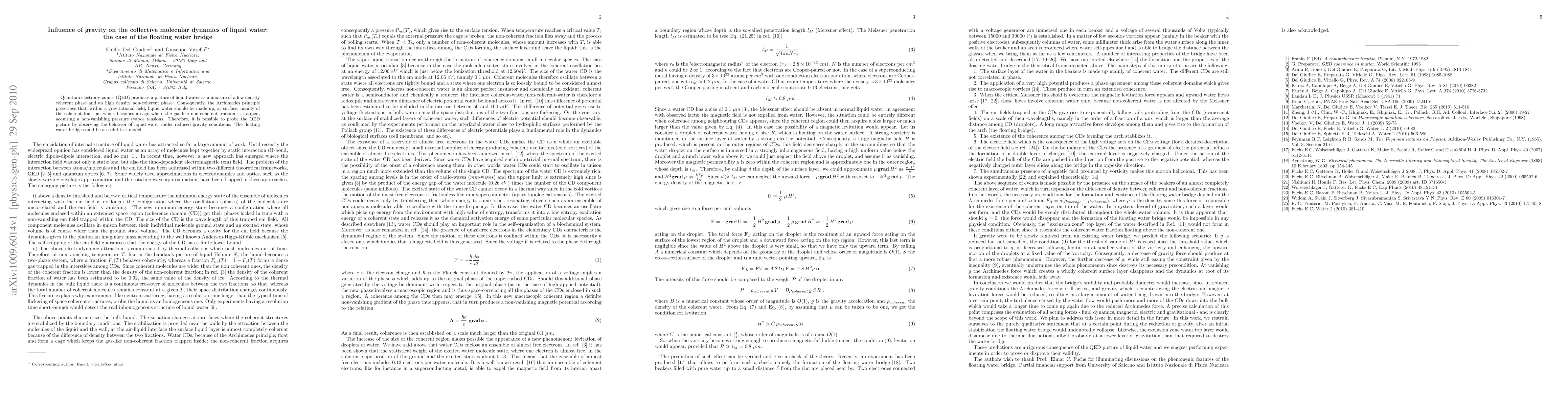 This paper explores how gravity influences the collective molecular dynamics of liquid water, specifically through the phenomenon of a floating water bridge. It investigates the QED-based model of liquid water, which distinguishes between low and high density phases, and uses the floating water bridge to test predictions about the distribution of these phases under reduced gravity.